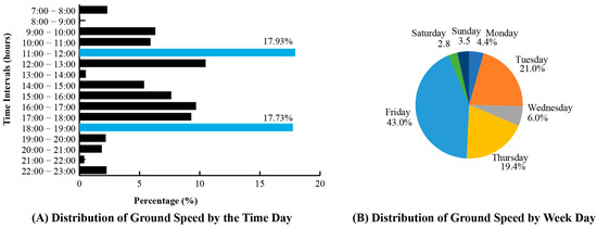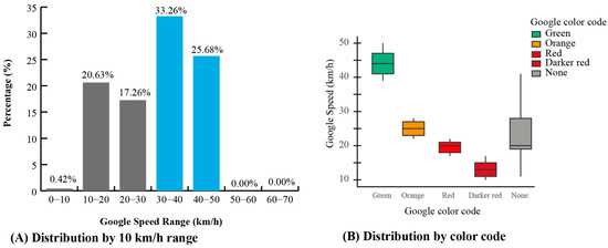 Speed aggregation was performed systematically for all road segments across different temporal dimensions, incorporating the seven days of the week and six time slots (06−08, 08−12, 12−14, 14−17, 17−19, and 19−06). The established adjustment equations between field measurements and Google traffic data were applied to supplement missing speed information, ensuring comprehensive coverage of the network. For segments lacking any traffic data, a conservative default speed of 30 km/h was assigned, based on typical urban driving conditions in similar contexts and Google’s typical traffic patterns.