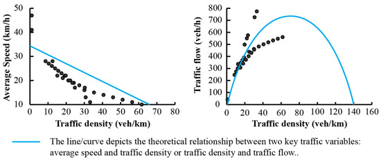 Figure 7. In the case of the traffic flow versus traffic density plot, only a single branch is available, which nevertheless supports the plausibility of the obtained values.
