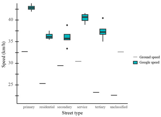 Figure 9. This comparison, stratified by street type, shows that Google-reported speeds tend to display greater variability than field measurements. Moreover, field data generally indicate lower average speeds across most street types when compared with Google Traffic.