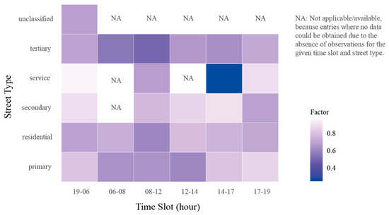 Figure 10). The extreme value (0.25) observed for service roads between 14:00–17:00 likely reflects localized anomalies such as temporary closures or a small sample size. The lowest factors correspond to segments with minimal observations, indicating that higher variability arises from data sparsity rather than measurement error, and these results are reported in