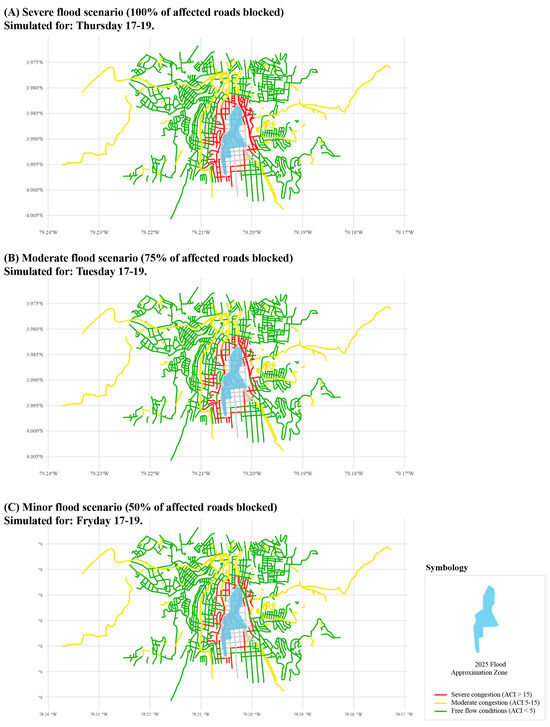 Figure 11). It is important to clarify the interpretation of the flood scenario percentages. The “100% impact scenario” signifies that 100% of the road segments within the predefined flood-prone polygon experience severe disruption (a 100-fold travel time penalty), not that 100% of the city’s entire road network is affected. The 75% and 50% scenarios, in turn, affect progressively smaller portions of the network by randomly selecting subsets of segments within this flood zone for penalty application. This approach allows for a systematic evaluation of how flood severity scales affect network-wide mobility, while preserving geographic realism by concentrating impacts in the historically flood-prone area.