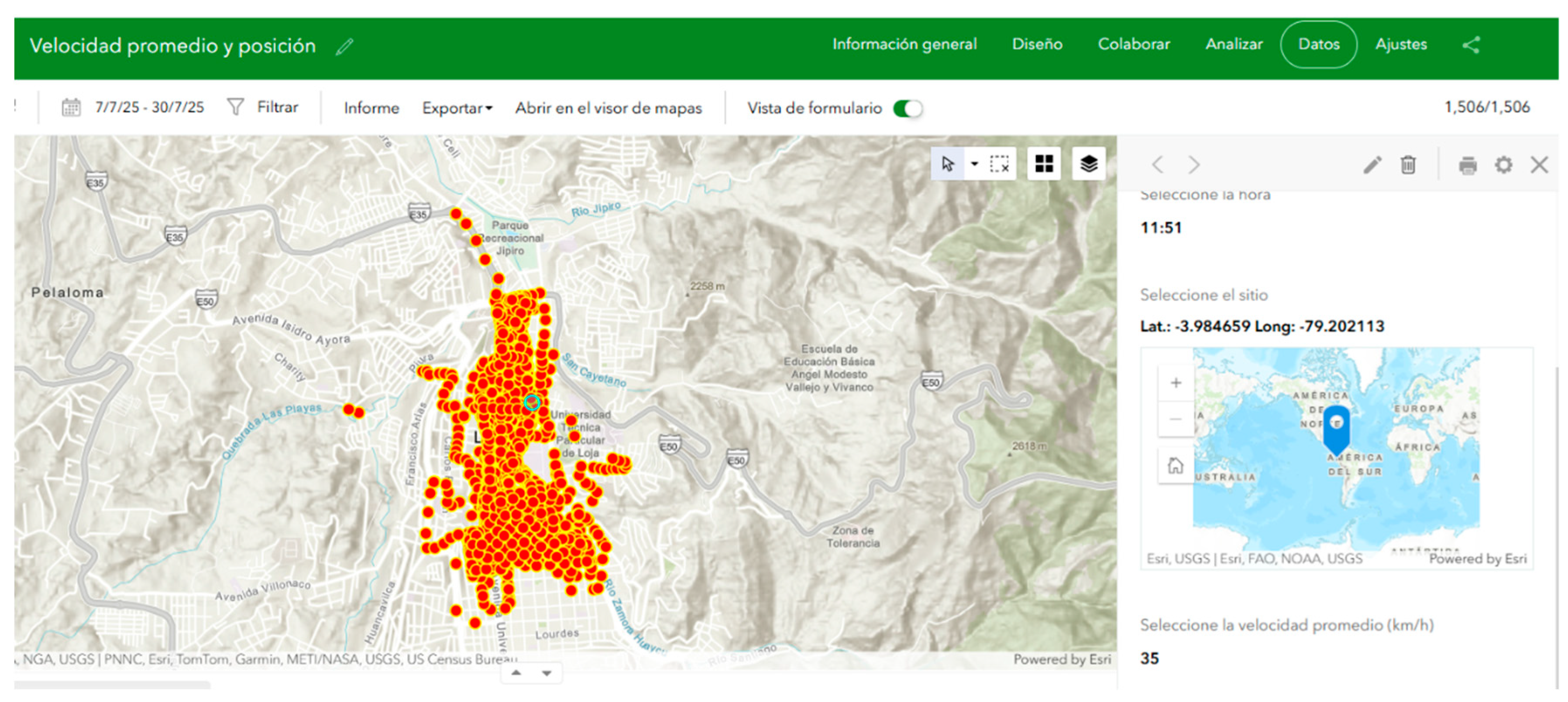 Google Traffic data were acquired through systematic manual observation of the platform’s color-coded traffic conditions across Loja’s road network within the defined study polygon. Given that Google does not provide public API access to historical traffic color-code data, a manual observation protocol was implemented. Couple trained observers worked in coordinated shifts to record traffic states at predetermined geographic coordinates during representative time periods, capturing typical urban mobility patterns throughout a complete weekly cycle.