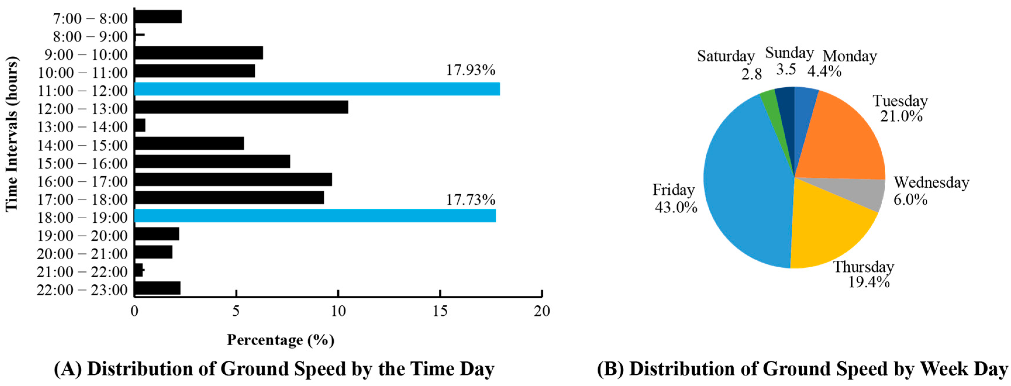 Several aspects of our field data collection methodology warrant explicit discussion regarding representativeness and potential biases. The temporal distribution shows an overrepresentation of Friday observations (43% of total), which resulted from logistical constraints during the July 2025 field campaign when coordination with available vehicles was most effective. However, three factors mitigate concerns about systematic temporal bias affecting our results: First, our primary analytical objective was capturing spatial variations in speed across different road segments and street types rather than modeling precise temporal traffic dynamics—the adjustment factor methodology specifically addresses temporal calibration by correcting field observations against Google’s systematically collected data across all days and time periods. Second, the most critical time slot identified (Thursday 17−19) was well-represented in our field data collection (127 observations), providing robust calibration for the scenarios most relevant to our flood impact analysis.