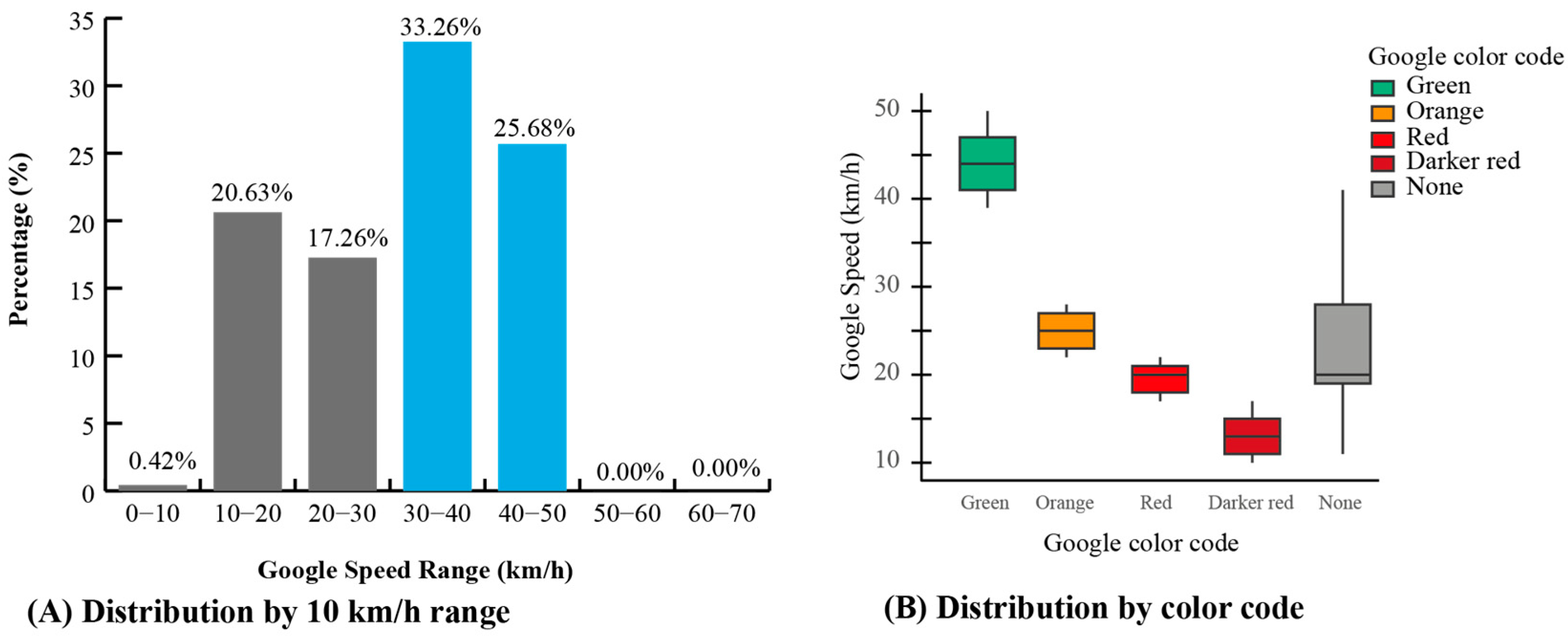 According to the same study, Google traffic colors can be associated with LOS levels as follows: A and B (green), C and D (orange), E (red), and F (dark red). Since Google provides color codes rather than explicit speed values, random speeds were assigned to each color based on the corresponding LOS category. For road segments without traffic color information, random speeds between 15 and 55 km/h were also assigned—following the ranges reported in the previous study. This “no color” condition typically reflects streets with limited user location data.