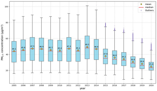 Box-and-Whisker Plot of Annual Average PM2.5 Concentration in the Yangtze River Economic Belt, 2005–2020.