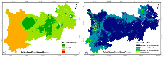 The Mann–Kendall significance test is a trend analysis method independent of data distribution, characterized by high robustness and broad applicability. It can be used to validate the reliability of Theil–Sen Median slope estimates. This study performs pixel-by-pixel calculations on PM2.5 data from 2005 to 2020 to analyze its significance. Details regarding the methodological descriptions and formulas can be found in Appendix B.1.