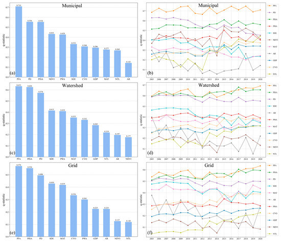 GeoDetector Factor Detector Results: (a) Municipal-scale 2005–2020 q mean histogram; (b) shows the line chart of q values at the Municipal-scale from 2005 to 2020; (c) shows the histogram of q mean values at the watershed-scale from 2005 to 2020; (d) shows the line chart of q values at the watershed-scale from 2005 to 2020; (e) shows the histogram of q mean values at the grid-scale from 2005 to 2020; (f) shows the line chart of q values at the grid-scale from 2005 to 2020.