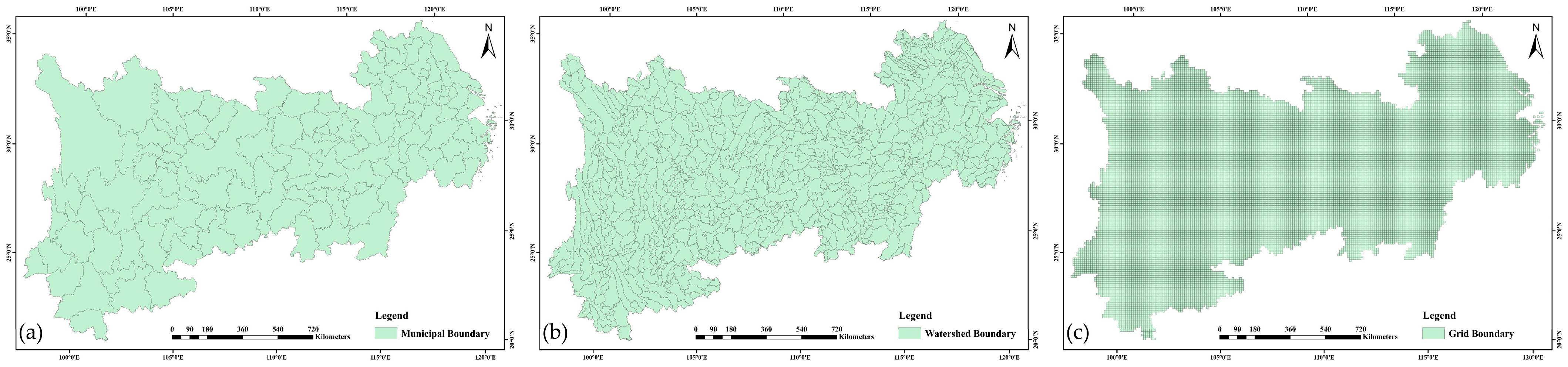 - Peng, S. 1-km Monthly Precipitation Dataset for China (1901–2024). National Tibetan Plateau/Third Pole Environment Data Center. 2020. Available online: https://data.tpdc.ac.cn/en/data/faae7605-a0f2-4d18-b28f-5cee413766a2 (accessed on 28 October 2025).