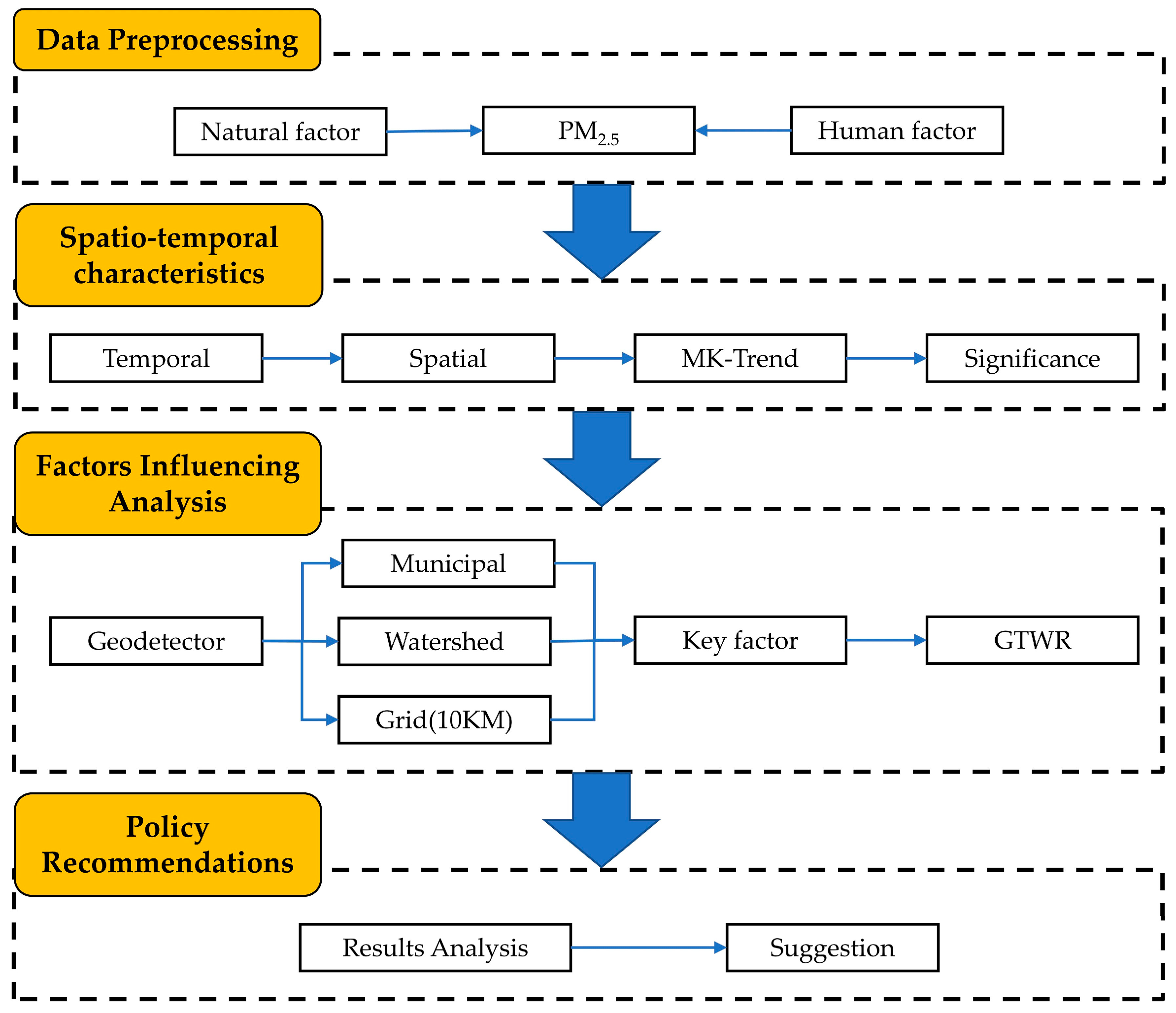 - Xu, Y.; Guo, Z.; Zheng, Z.; Dai, Q.; Zhao, C.; Huang, W. Study of the PM2.5 Concentration Variation and its Influencing Factors in the Beijing-Tianjin-Hebei Urban Agglomeration Using Geo-Detector. Res. Environ. Sci. 2023, 36, 649–659. [Google Scholar] [CrossRef]