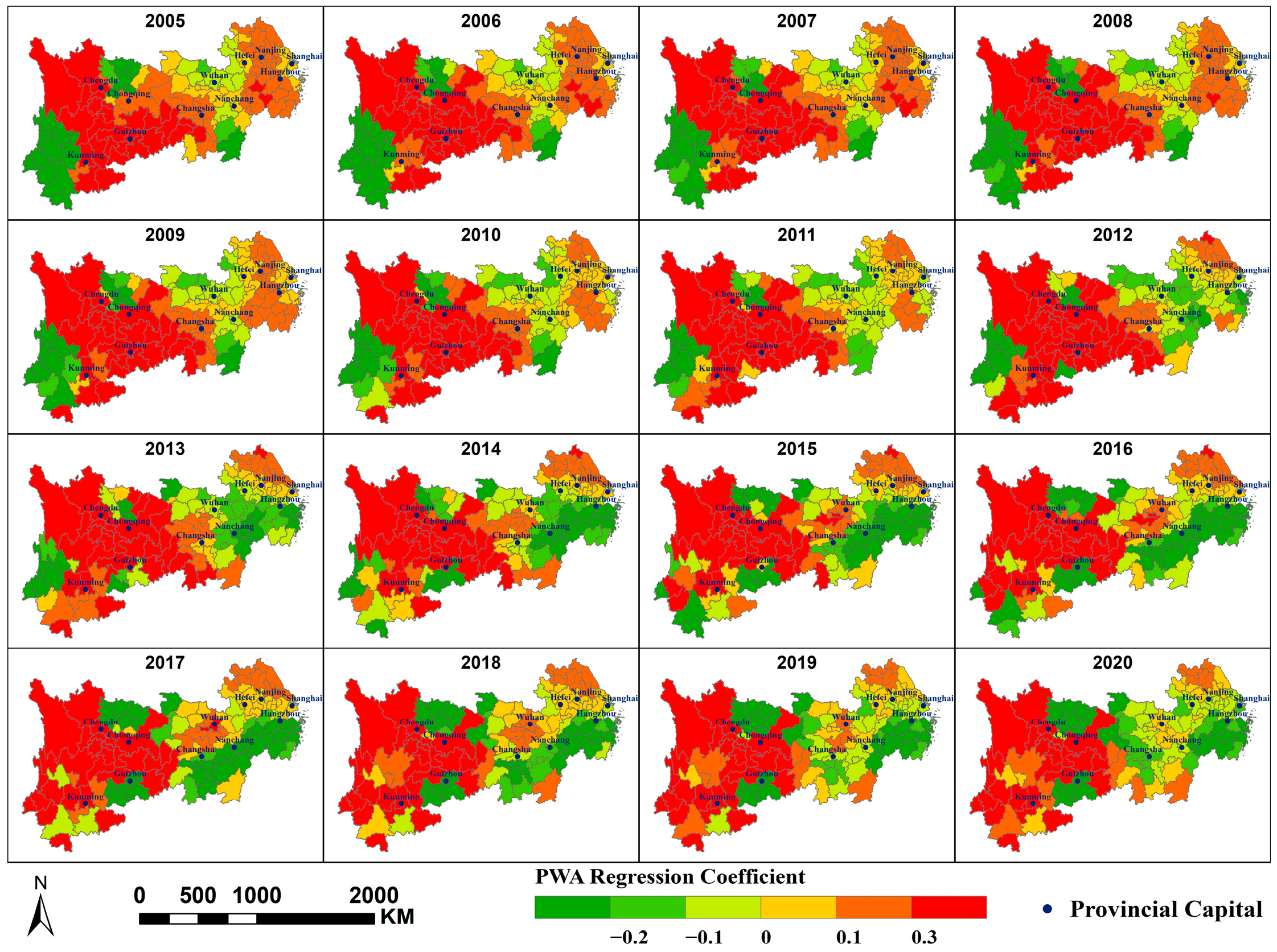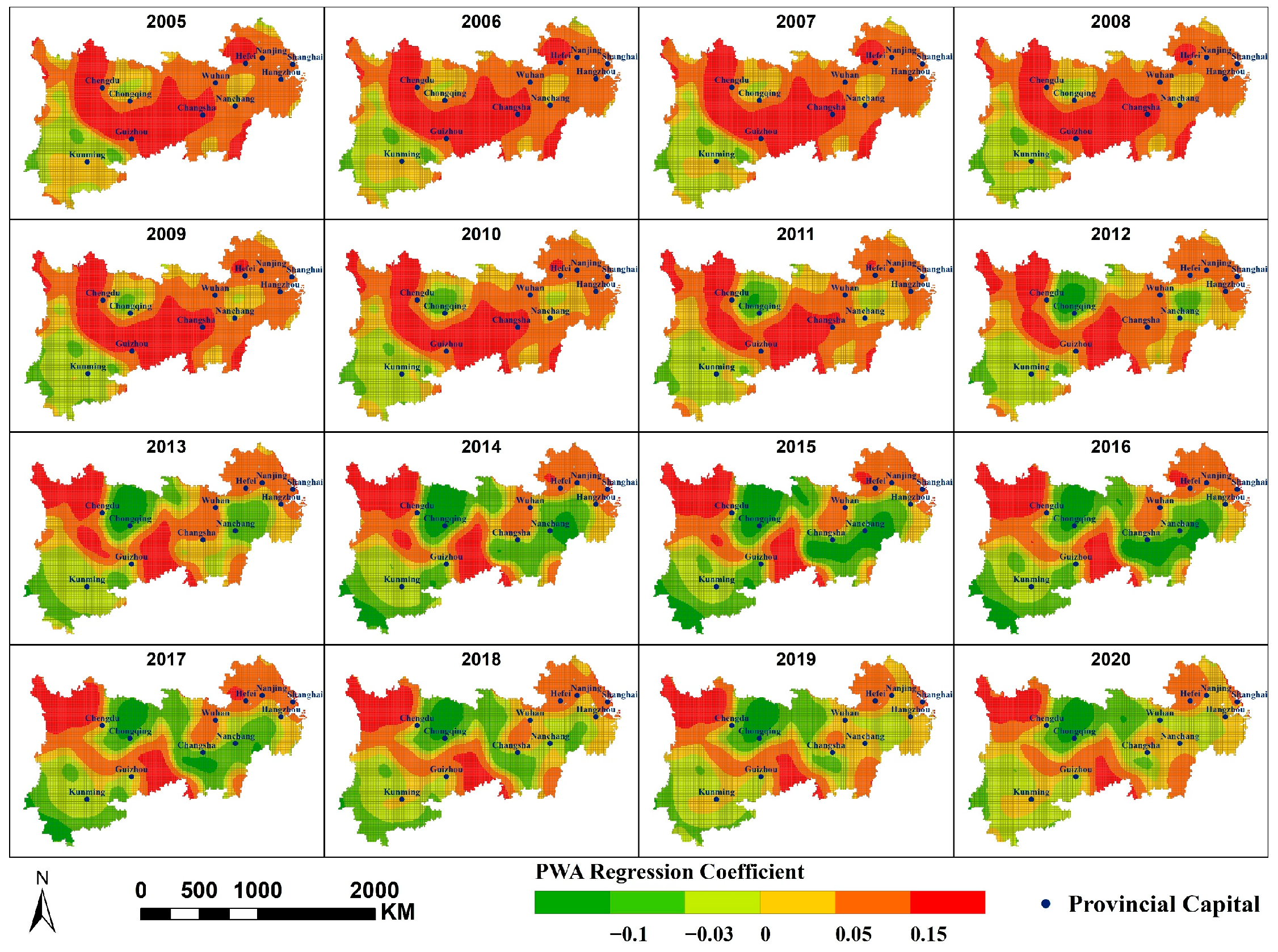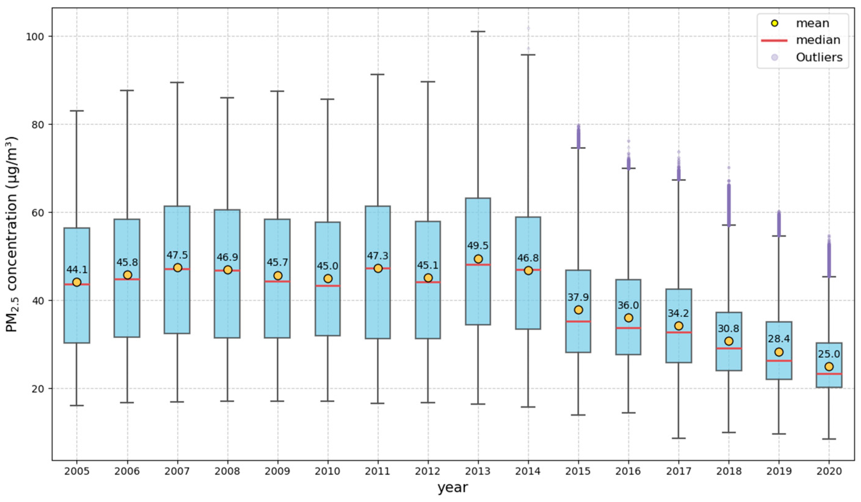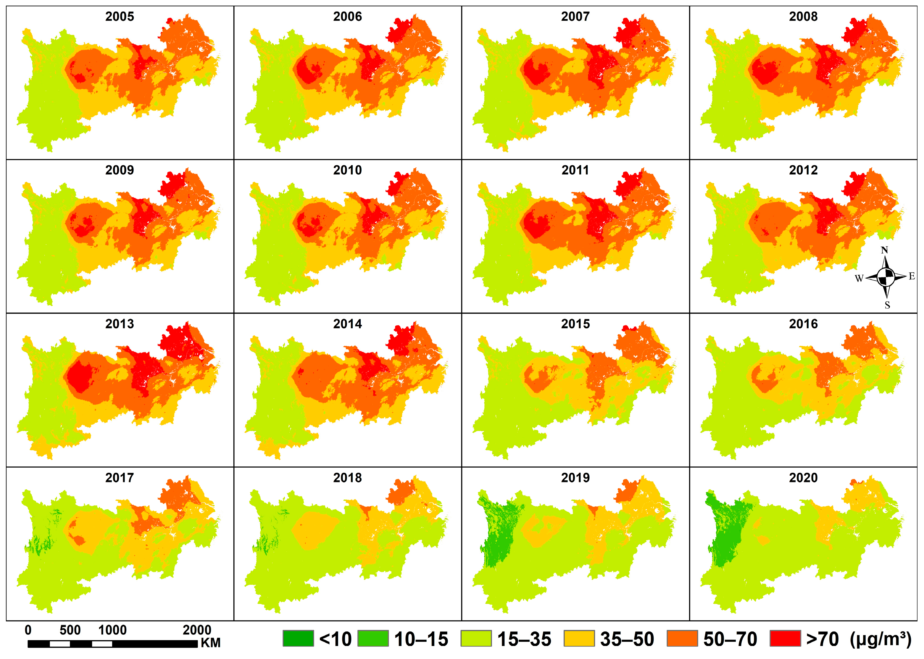 - From 2005 to 2020, the annual average PM2.5 concentration in the Yangtze River Economic Belt showed a significant overall downward trend in both spatiotemporal variations, with no regions exhibiting a notable increase. PM2.5 concentrations decreased slowly in the western region, while they declined more rapidly in the central and eastern regions.