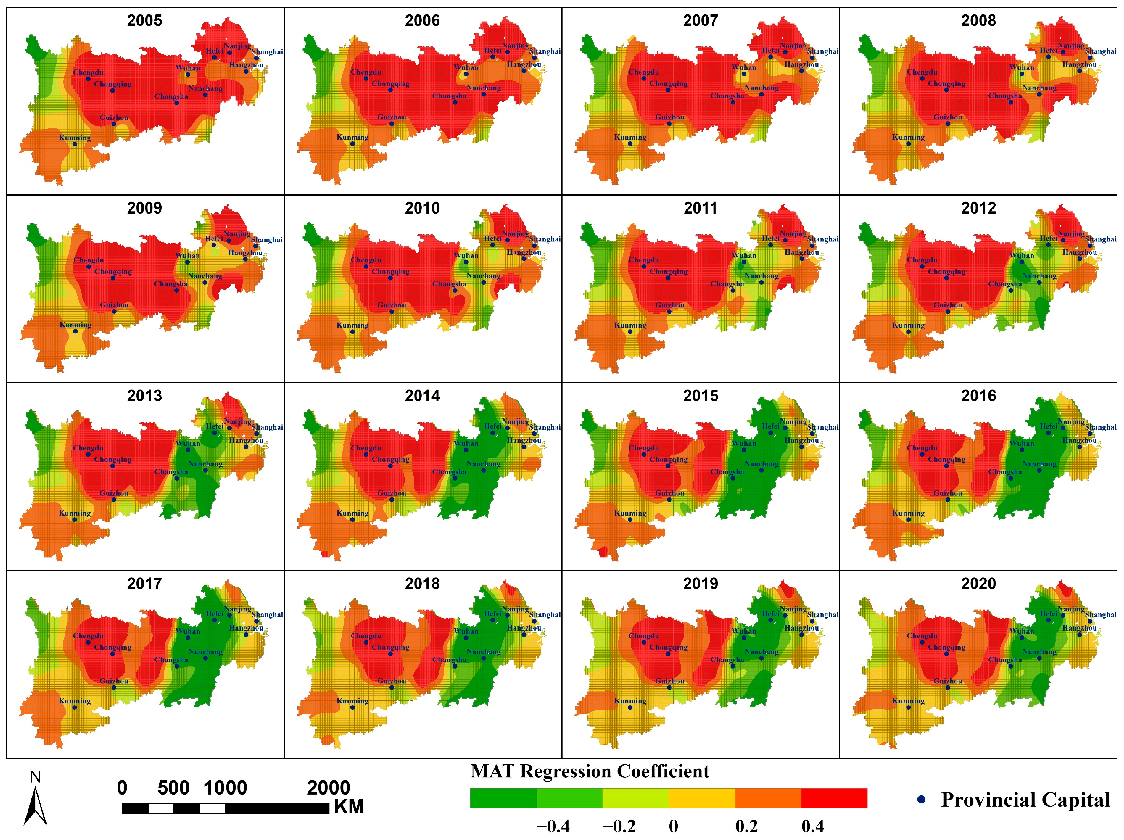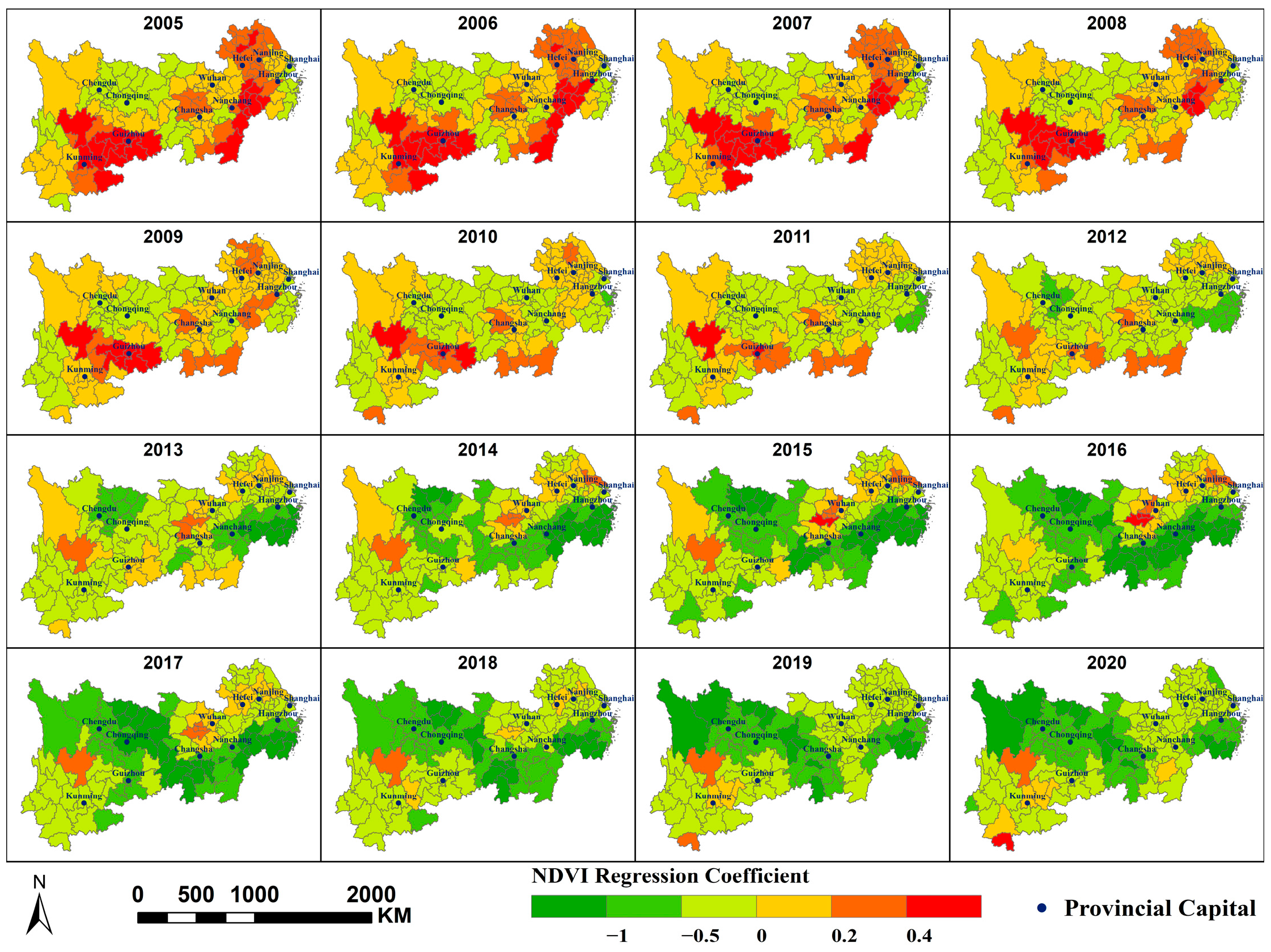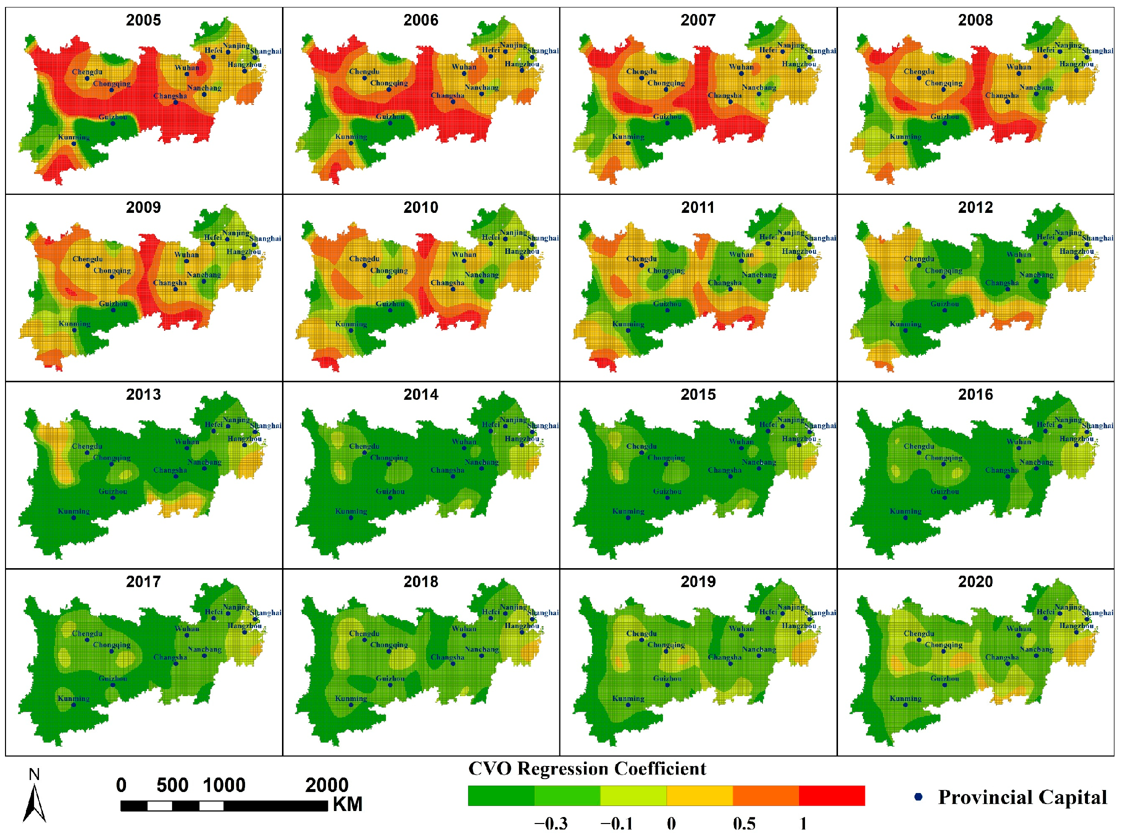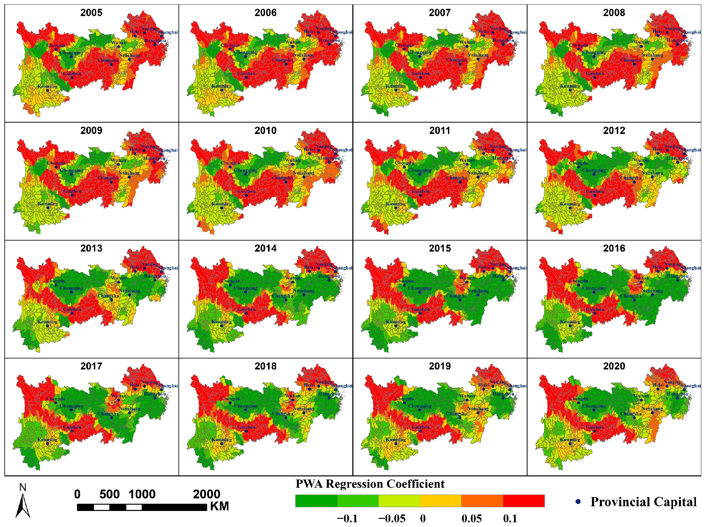 - From 2005 to 2020, the annual average PM2.5 concentration in the Yangtze River Economic Belt showed a significant overall downward trend in both spatiotemporal variations, with no regions exhibiting a notable increase. PM2.5 concentrations decreased slowly in the western region, while they declined more rapidly in the central and eastern regions.