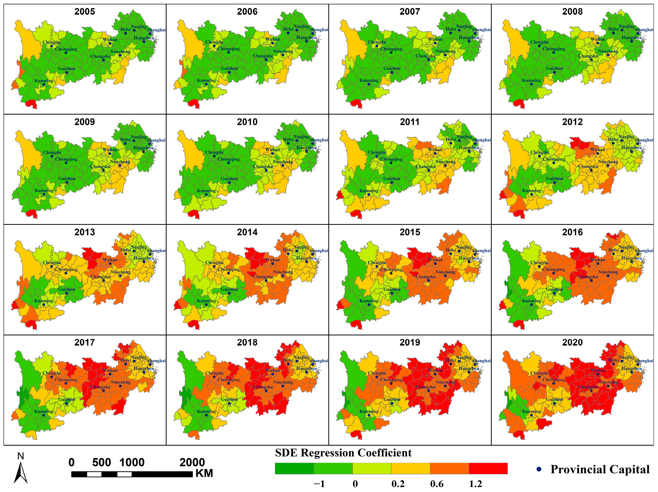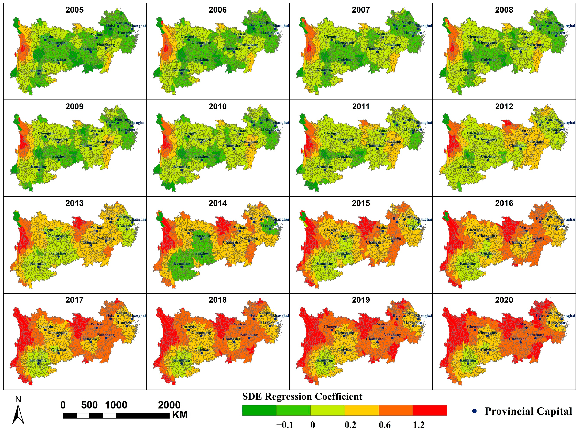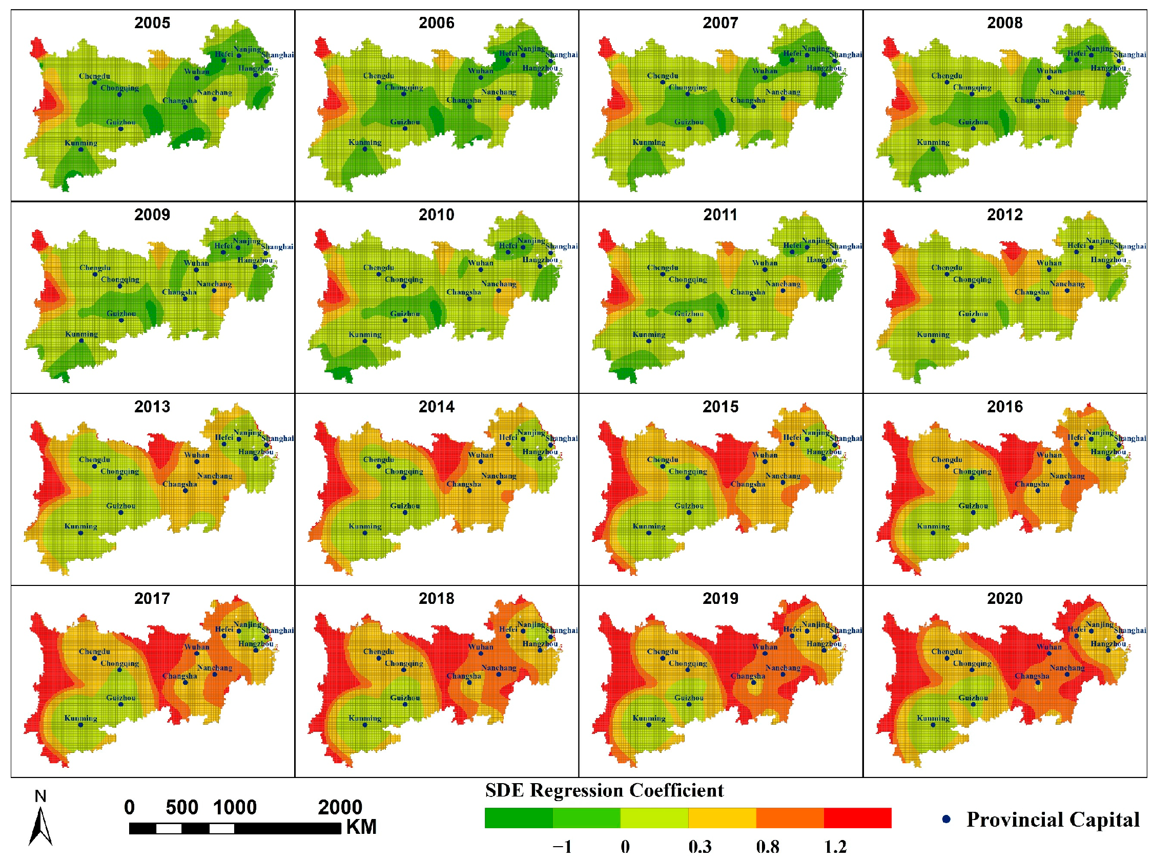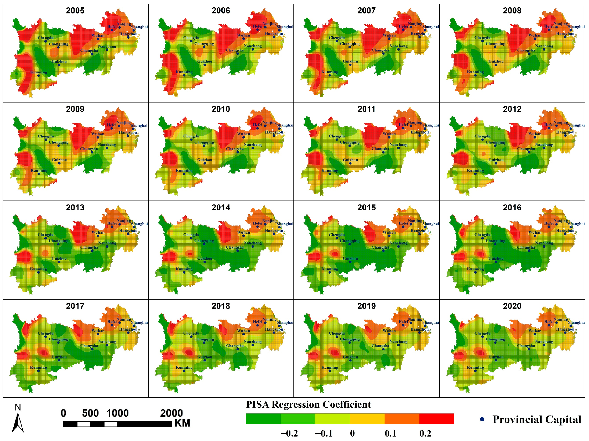 - From 2005 to 2020, the annual average PM2.5 concentration in the Yangtze River Economic Belt exhibited an inverted U-shaped trend over time, with 2013 serving as the inflection point. Spatially, the annual average PM2.5 concentration in the Yangtze River Economic Belt showed a distribution pattern of lower levels in the west and higher levels in the central and eastern regions, revealing distinct agglomeration characteristics.