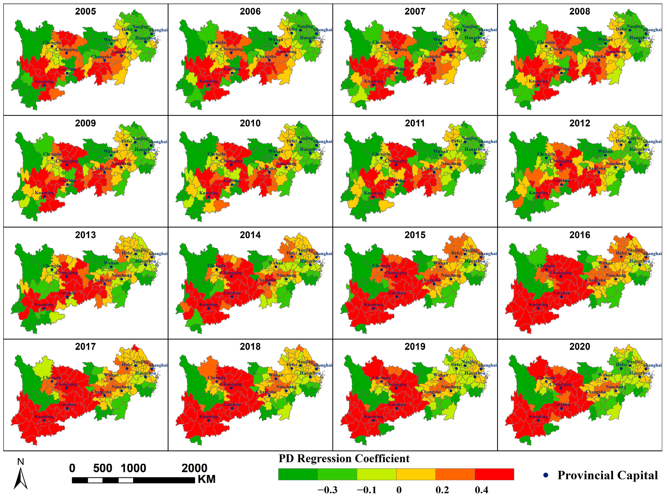 - NDVI, CVO, and PM2.5 concentration primarily exhibit a negative correlation; MAT, PFA, PD, and SDE primarily exhibit a positive correlation with PM2.5 concentration; and PWA and PISA exert dual effects on PM2.5 concentrations within the region, each covering approximately half the area. At different scales, the spatial distribution of the same factor’s impact on PM2.5 concentrations is largely consistent, though some variations exist. A smaller scale would yield more refined results.