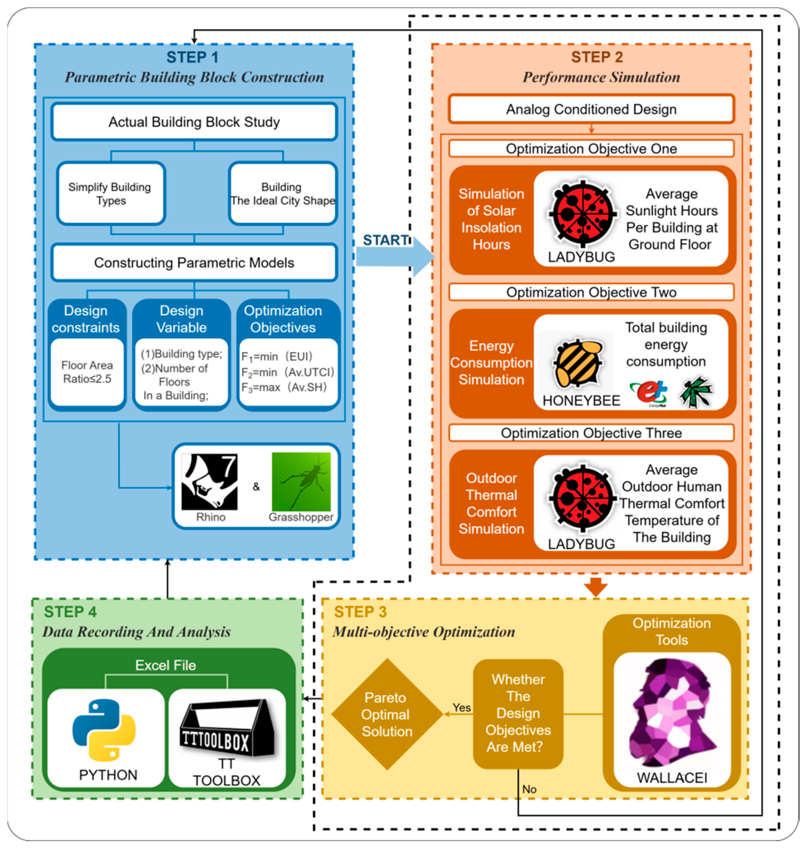 Optimization algorithms enable researchers to efficiently identify superior designs while maximizing design objectives within established constraints. A variety of plugins have been created for urban optimization and construction purposes. Rhino and Grasshopper, the leading parametric platforms for designers, have integrated numerous optimization features. Key plugins in Grasshopper comprise Galapagos [61], Octopus [62], and Wallacei [15], among others. Designers can utilize various optimization tools to iteratively compute optimal solutions in both multi-objective and single-objective contexts, thereby offering valuable support and reference for design processes. Wallacei provides the NSGA-II algorithm, which improves the visualization and analysis of optimization results. The NSGA-II algorithm offers several advantages, including high computational efficiency, effective diversity in solution sets, and the capability to address low-dimensional optimization problems [63].