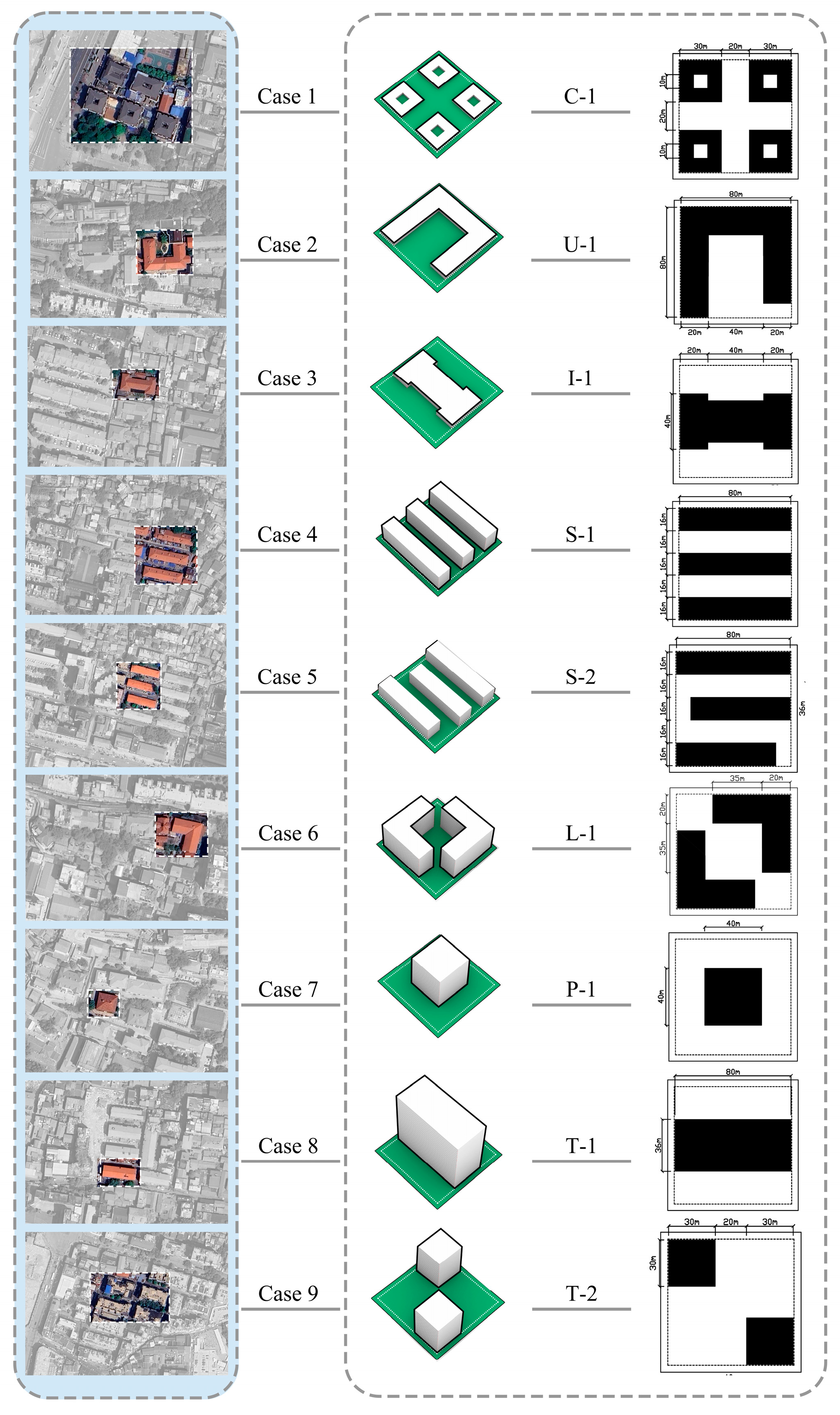 Recently, the architectural typology method has been extensively utilized in neighborhood form research [73,74]. This method entails a thorough investigation and analysis of neighborhood forms, facilitating the effective simplification and extraction of the most representative architectural prototypes. The extracted architectural prototypes effectively represent the fundamental geometric characteristics of real neighborhood forms [75,77]. This study utilizes findings from prior research [21,22,78,79], focusing on actual neighborhoods in the Wuhan region. It systematically extracts typical residential architectural prototypes, as illustrated in Figure 3. Nine layout types have been identified from the cases: one L-shaped, one U-shaped, one I-shaped, two tower blocks, two slab buildings, one point-shaped, and one courtyard layout. These types exemplify the typical urban neighborhood configurations frequently employed in urban design practices. Table 1 presents the geometric parameters for each building prototype.
