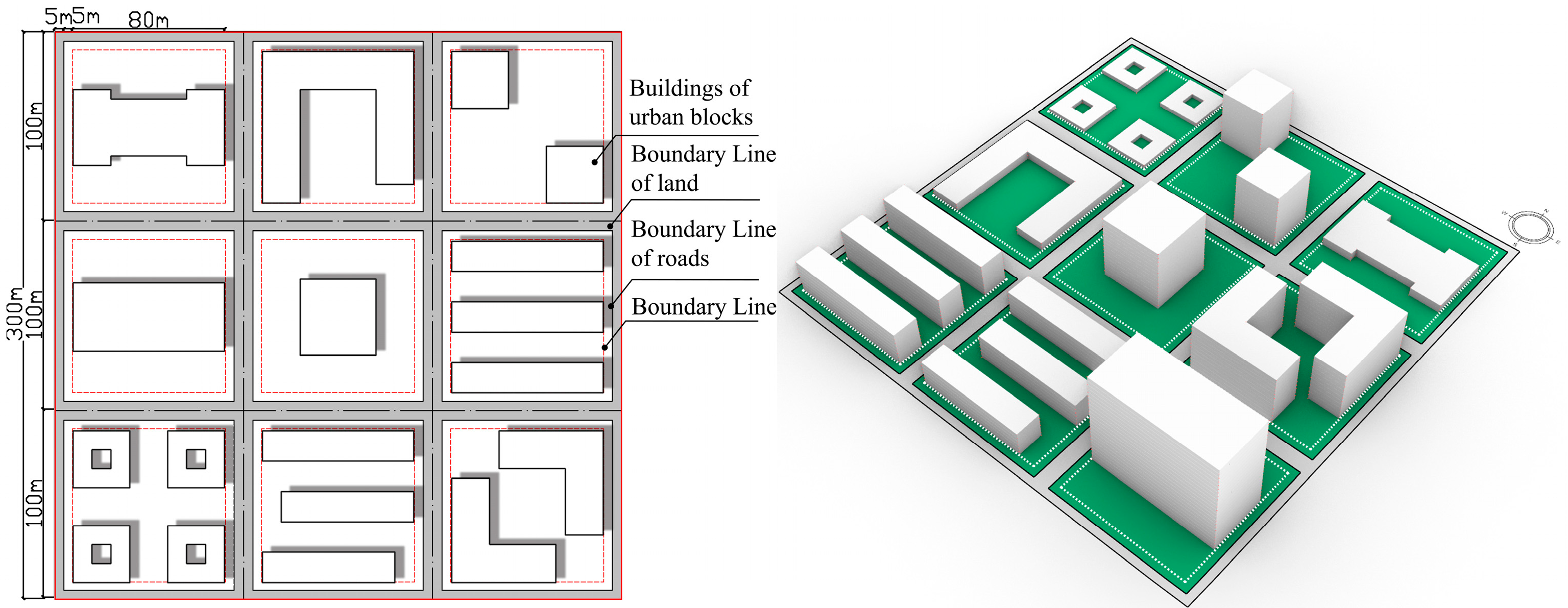 The block form consists of fundamental building units, open spaces, roadways, and additional components. This study defines the size of an ideal plot as 300 m × 300 m, which is subdivided into nine land units of 100 m × 100 m, as illustrated in Figure 4. The boundaries of each land unit are set 5 m inward from the road boundary line, while the building boundaries are positioned 10 m inward. The developable area within the building line measures 80 m × 80 m, precisely matching the dimensions necessary for a single building type. Moreover, each ideal block is consistently oriented toward the south. Figure 4 depicts the optimal neighborhood configuration consisting of the nine building types suggested in this research.
