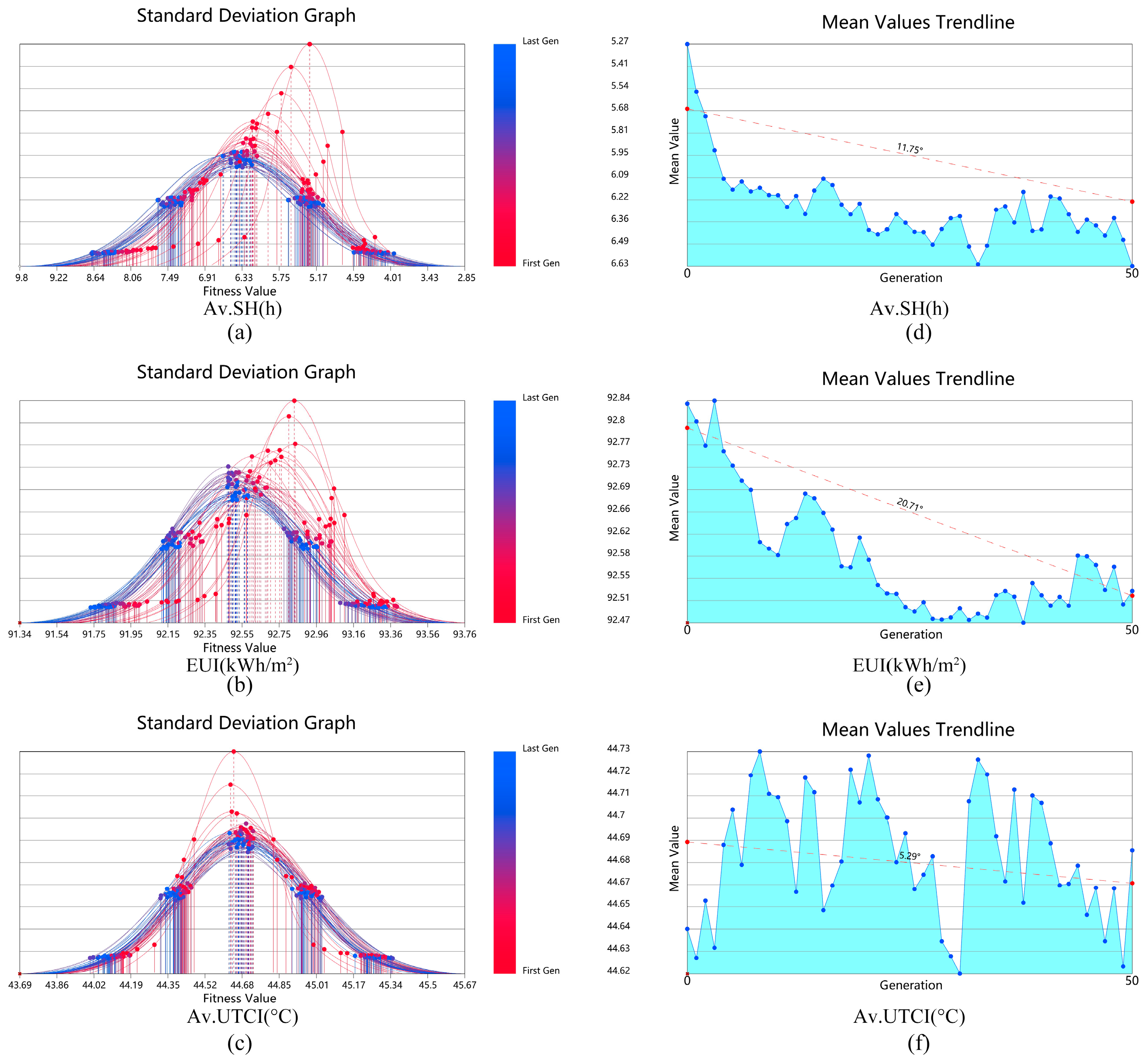 Figure 7. Trends in different objectives in the optimization process (Second simulation). (a) Av.SH(h) Standard Deviation Graph of Av.SH. (b) Standard Deviation Graph of EUI. (c) Standard Deviation Graph of Av.UTCI. (d) Mean Values Trendline of Av.SH. (e) Mean Values Trendline of EUI. (f) Mean Values Trendline of Av.UTCI.