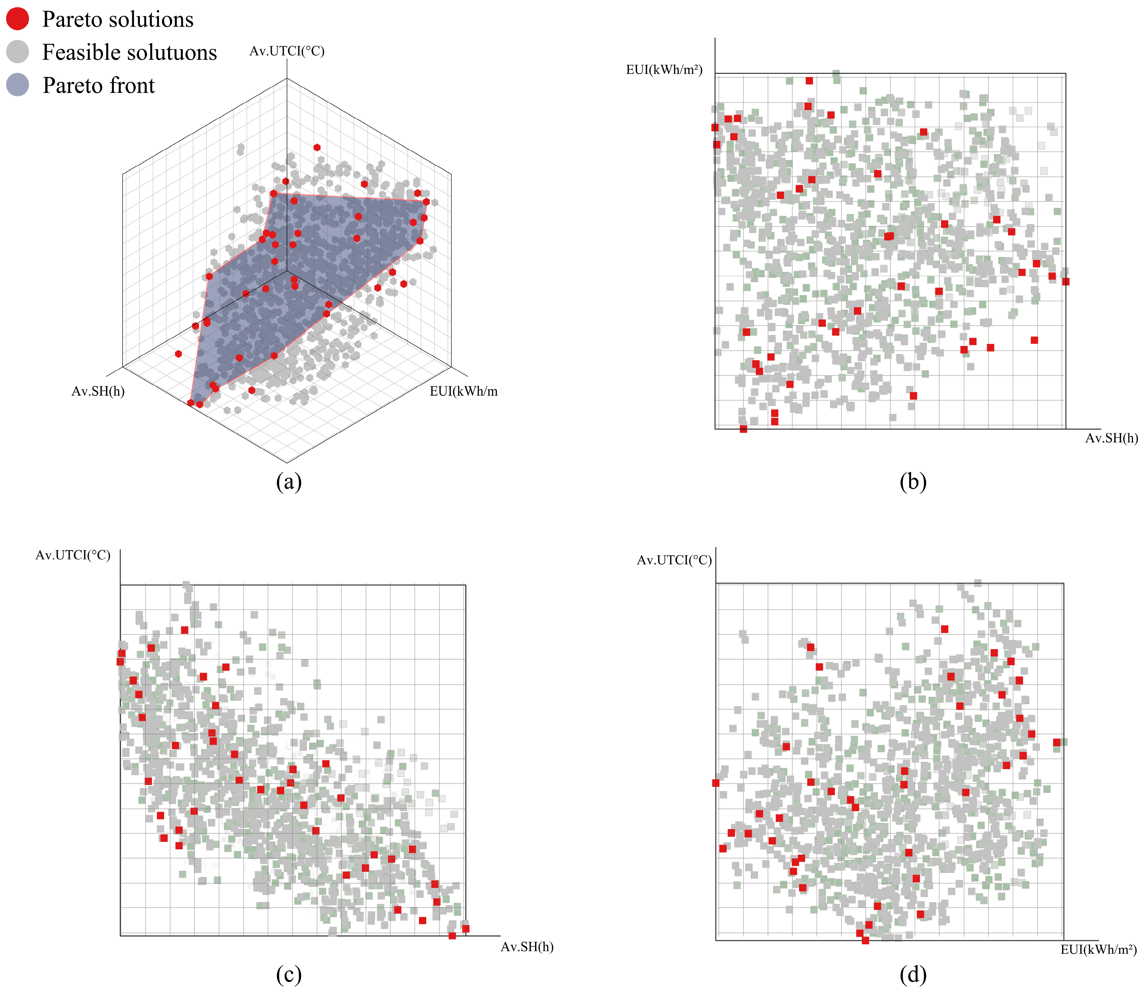 Figure 9. Pareto Front and Two-Dimensional Projection Analysis for Multi-Objective Optimization. (a) 3D Pareto Front of Av.SH, EUI, and Av.UTCI. (b) 2D Projection of Av.SH vs. EUI. (c) 2D Projection of Av.SH vs. Av.UTCI). (d) 2D Projection of EUI vs. Av.UTCI.