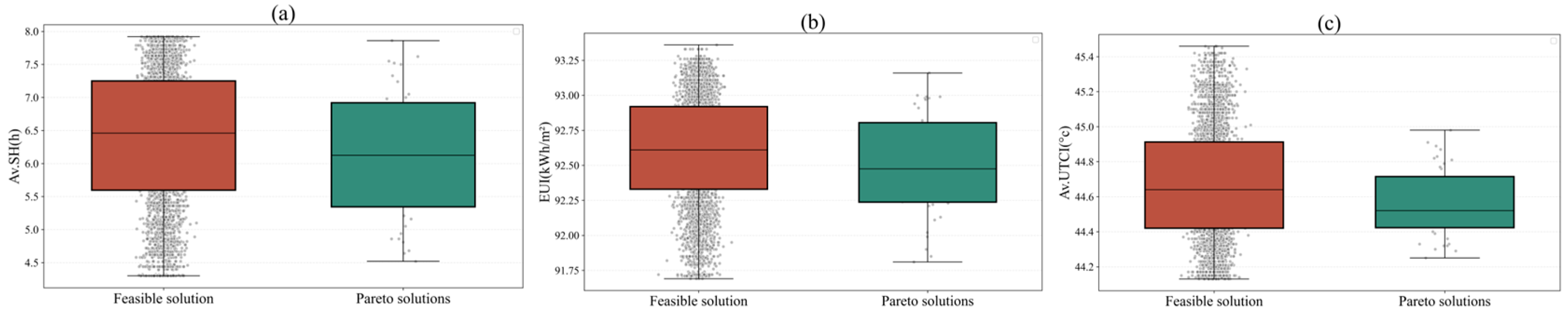 Figure 10. Comparison of the distribution differences between feasible solutions and Pareto solutions across various objectives. (a) Boxplot comparison of Av.SH for feasible vs. Pareto solutions; (b) Boxplot comparison of EUI for feasible vs. Pareto solutions. (c) Boxplot comparison of Av.UTCI for feasible vs. Pareto solutions.