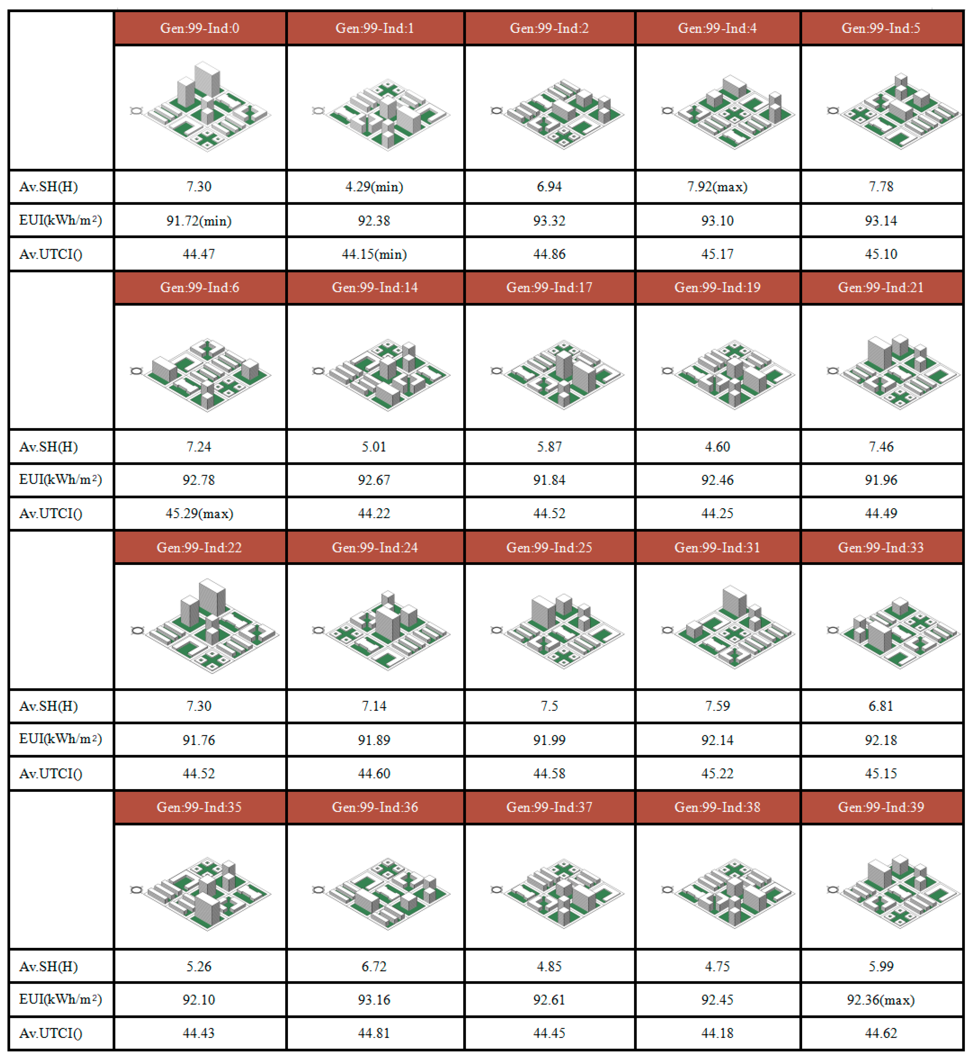 After conducting parametric modeling in block form, the next steps entail assessing their individual performance. Urban block designs must aim to minimize energy consumption, maximize the use of on-site renewable energy, and improve overall livability. This study assessed the performance of the generated block forms in terms of energy use, outdoor thermal comfort, and solar radiation exposure. The following metrics were introduced: building total energy consumption intensity (EUI), average building outdoor thermal comfort degree (Av. UTCI), and average south-facing first-floor solar radiation hours on the coldest day (SH). Table 2 presents comprehensive calculations for the optimization objectives of this performance simulation, accompanied by illustrative diagrams.