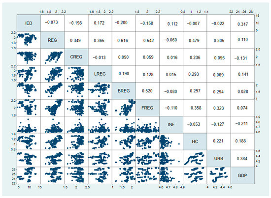 Table 1 presents the descriptive statistics for both the dependent and independent variables in logarithmic forms. The sample statistics show that the mean value of IED is 9.363, with a standard deviation of 1.772. Moreover, the mean values of IED15–24 and IED25+ are 7.173 and 9.331, respectively, indicating that adults are more engaged in the informal sector compared to youth. According to the same table, the mean aggregate regulation index is about 1.981. When considering the different areas of regulation, the credit market regulation exhibits the highest mean value (2.140), reflecting the most flexible regulatory environment. This is followed by freedom to compete (2.104), labor market regulation (1.907), and finally, business regulation (1.812). Figure 1 presents the data distribution using a scatter plot matrix along with Kendall’s rank correlation coefficients, providing an initial overview of the association among the variables, indicating whether they are positive or negative. This analysis particularly focuses on the association between the dependent variable (IED) and the explanatory variables (regulatory framework variables and control variables). The results indicate that informal employment among PWDs is negatively associated with regulatory indicators. However, a notable exception is observed with labor market regulation, which exhibits a positive correlation with IED. These findings provide preliminary evidence on the connection between regulations and informal employment among PWDs. Additionally, it is important to highlight that none of the covariates exhibit a strong correlation exceeding 0.8, indicating the absence of multicollinearity issues.