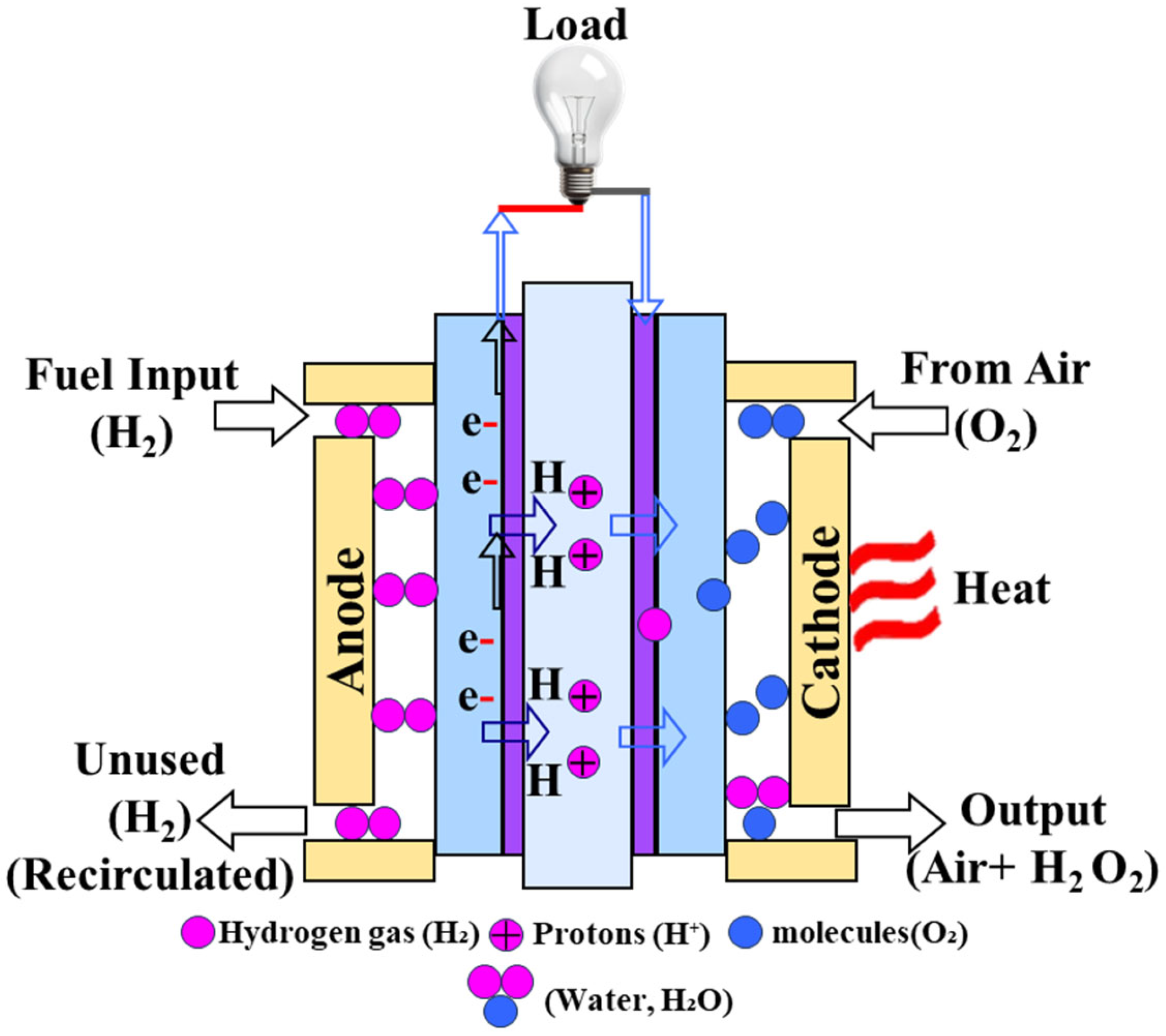 Cathode Reaction Reduction: At the cathode, oxygen gas O 2 mixes with protons and electrons from the electrolyte, and the electrons travel through the external circuit. The reduction reaction generates water H 2 O and heat [10]. Combining the anode and cathode reactions yields the overall chemical reaction, which can be expressed as follows: