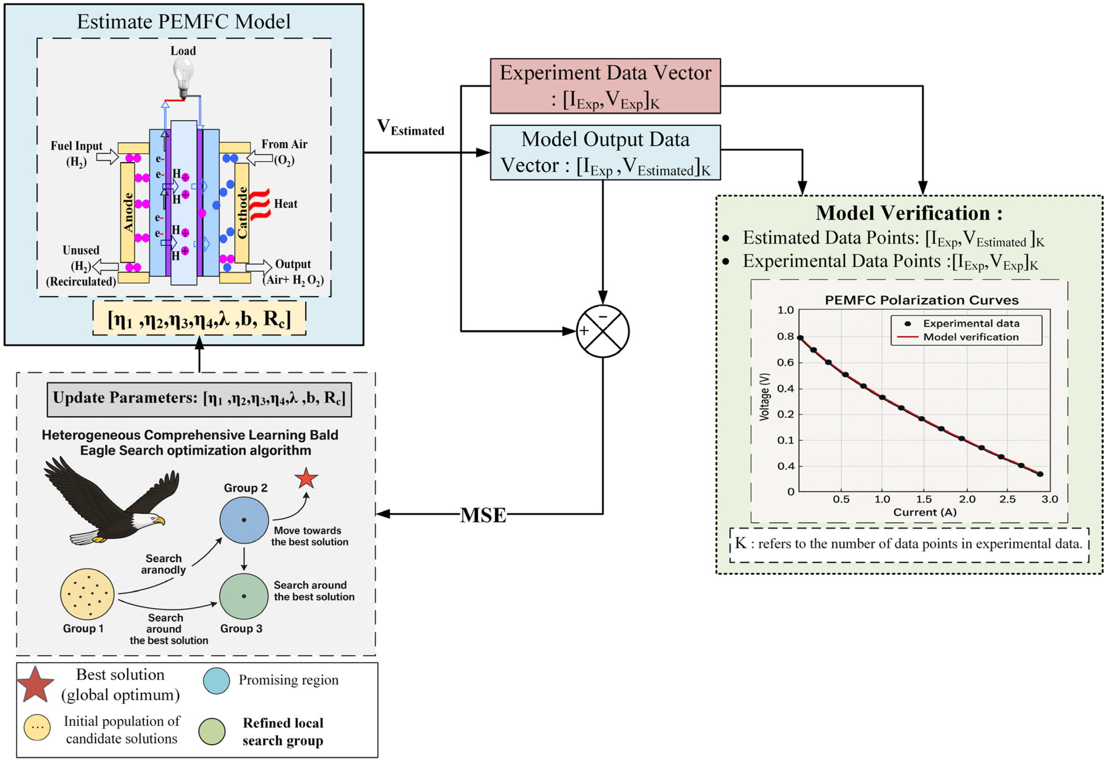 In the same context, Alsattar et al. [55] presented the BES meta-heuristic algorithm, structuring search into surveying, swooping, swooping, and capturing phases to balance exploration and exploitation; however, its application to PEMFC parameter estimation remains unexplored across different fuel cell configurations. Rao et al. [26] employed the SSO optimizer, emphasizing its simplicity and global search capability, although its convergence rate diminished for higher-dimensional problems. Other studies have explored the probabilistic and physics-inspired algorithms. Abdel-Basset et al. [27] proposed a HBO algorithm, which integrates efficient data structures to accelerate the search process. Li et al. [28] introduced the SMS algorithm, demonstrating enhanced population diversity and improved avoidance of local optima. Although there have been advances in search algorithms, purely population-based algorithms often require extensive parameter tuning and are prone to stagnation in local optima. To overcome these issues, hybrid algorithms have been developed to leverage the complementary strengths of different metaheuristics. Fathy et al. [47] introduced an optimizer called Vortex Search with Differential Evolution (VS-DE) optimizer, which integrates Lévy-flight sampling into DE’s mutation process to enhance convergence performance under varying operating conditions. Niu et al. [35] enhanced the BBO optimizer with mutation strategies (BBO-M) for efficient parameter identification in modeling the solar cells and PEMFCs. The algorithm improves the standard BBO algorithm by integrating mutation mechanisms inspired by DE and chaos theory to strengthen global search performance. The algorithm improves both the searching ability and the speed of convergence. Turgut and Çoban [36], proposed an enhanced TLBO with an elite retention approach to preserve high-quality solutions between iterations to speed convergence at the cost of added algorithm complexity. This modification accelerates convergence in parameter estimations in PEMFC modeling but introduces additional implementation complexity. Xu et al. [30] combined the JAYA algorithm with Nelder-Mead simplex refinement, employing JAYA for global exploration and simplex for local fine-tuning, which resulted in less error in fitting curves. It appears that these studies reveal the development of numerous metaheuristic algorithms for PEMFC parameter identification. While effective to some extent, these methods often suffer from issues like premature convergence, limited exploration ability, and sensitivity to parameter tuning. A critical step in achieving the best performance and reliability of PEMFC models is the development of accurate mathematical models. Thus, the accuracy of such models is heavily dependent on accurate parameter estimation, which remains a challenging optimization task given the nonlinear, multivariable, and highly coupled nature of PEMFC dynamics. In order to address these challenges, this study proposes a novel optimization algorithm called the Heterogeneous Comprehensive Learning Bald Eagle Search (HCLBES) for accurate parameter estimation of different PEMFC models. The HCLBES algorithm improves the original Bald Eagle Search (BES) method by adding different learning strategies and a way to share memory more effectively. We carried out extensive tests using PEMFC models with two different power levels to evaluate the performance of an HCLBES algorithm. These include a PEMFC 250 W stack [30] and three widely used PEMFC 500 W stacks (NedStack PS6, BCS 500 W, and Horizon 500 W) [28]. The diverse characteristics of these fuel cell stacks provided a robust testbed for validating the adaptability and accuracy of the proposed algorithm. The primary contributions of this work can be summarized as follows: