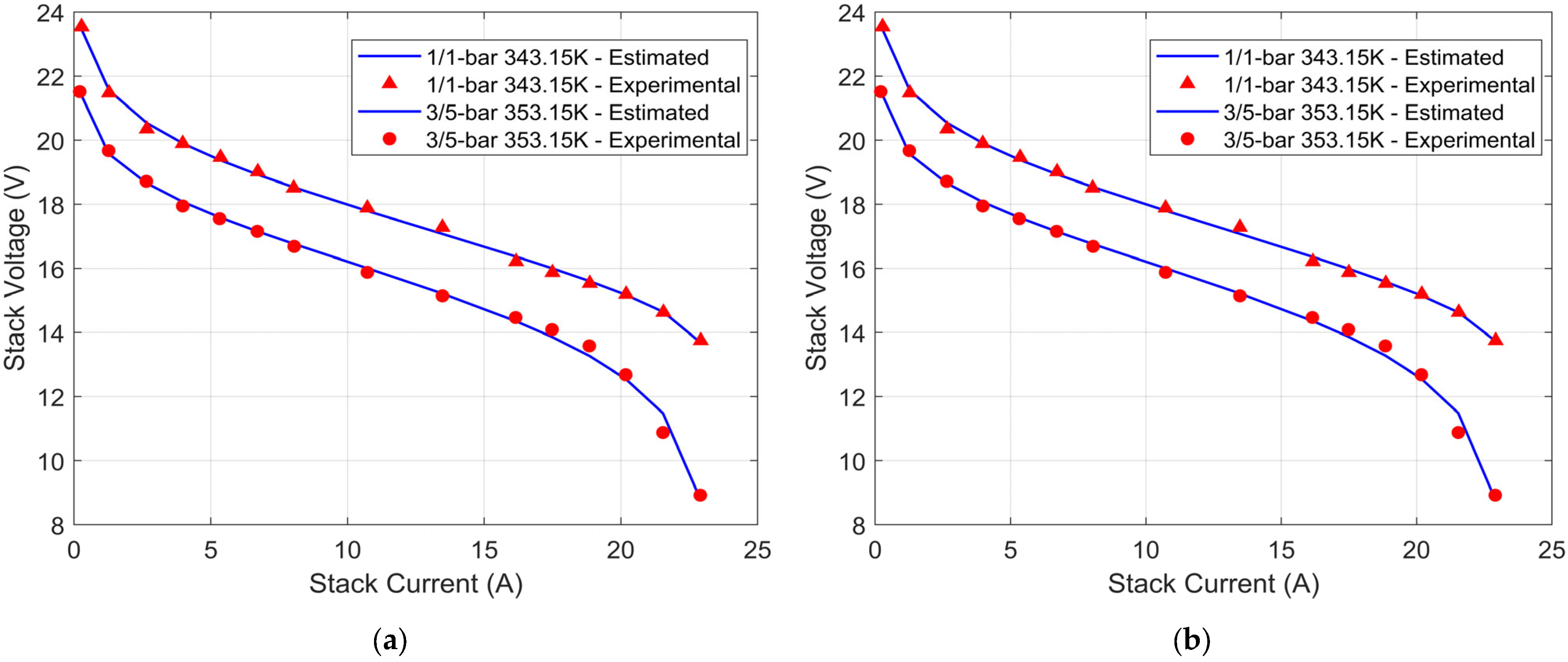 These parameters directly influence the predicted cell voltage: overpotential coefficients η 1 η 4 affect the activation losses, λ affects proton conductivity and overall membrane performance, R c regulates resistive losses in electron conduction, and b controls the slope of the voltage–current relationship. Understanding the sensitivity of cell voltage to these parameters is essential for accurate modeling and optimization of PEMFC performance.