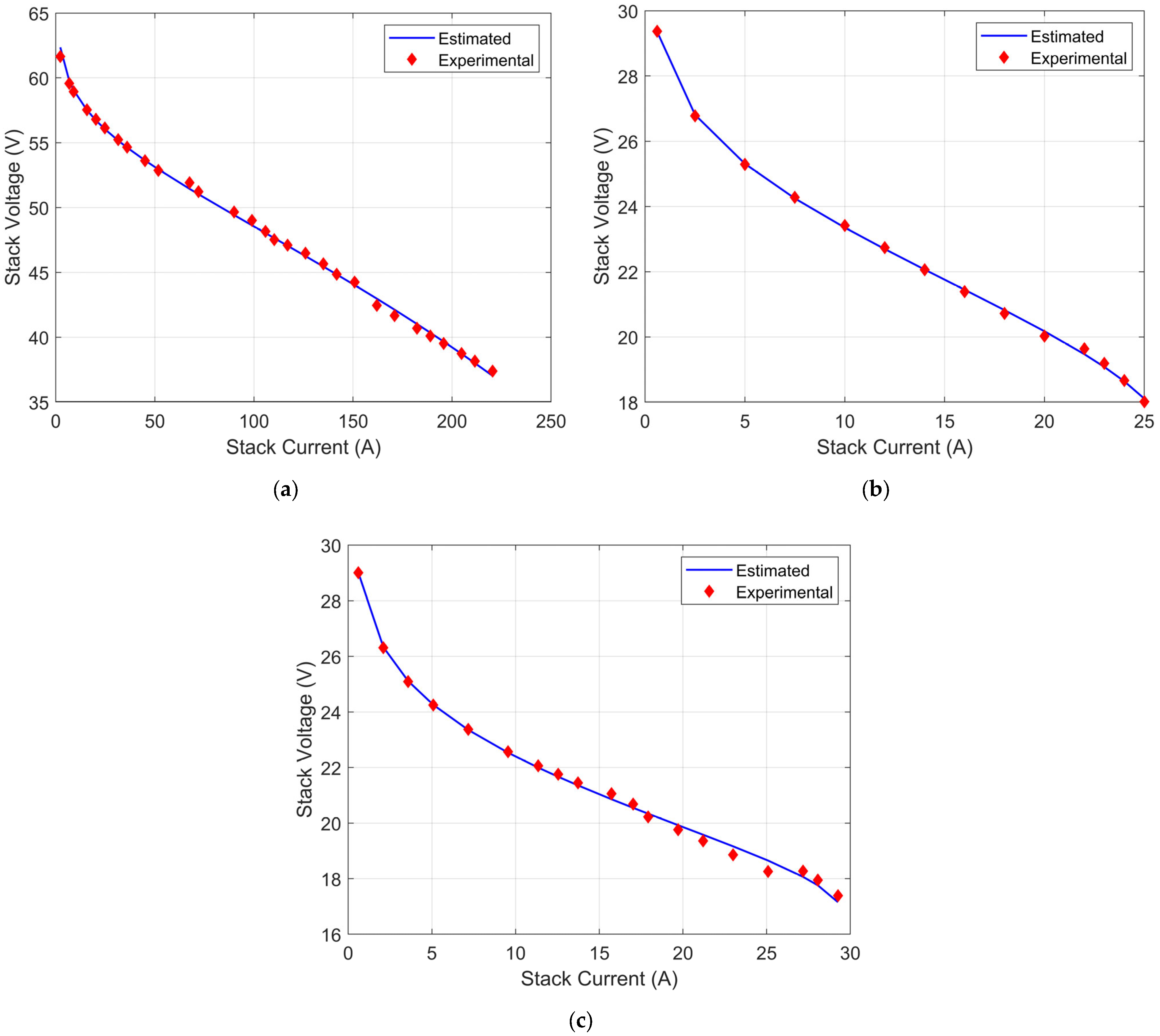 Empirical and semi-empirical mathematical models of PEMFC originated from pioneering studies that established fundamental voltage–current correlations [11,12,52,53,54]. Amphlett et al. [11] developed an empirical model for the Ballard Mark IV cell, fitting activation and concentration overpotentials to polarization data via nonlinear regression and demonstrating accurate predictions over a limited current range [53]. Amphlett and colleagues explored scale-up effects in a PEMFC stack with a power rating of 5 kW, underscoring challenges in scaling parameters between models of fuel cells with different power ratings [52]. Rowe and Li [54] enhanced physics-based modeling by incorporating proton transport resistance and water management effects, improving dynamic performance predictions but highlighting sensitivity to initial parameter estimates of the PMFC model. Squadrito et al. [12] proposed streamlined expressions for activation and ohmic losses, offering simplified curve-fit parameters still used as benchmarks in later studies.