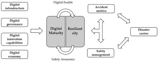 Digital maturity and resilience systems can be seen as two subsystems interacting with each other, as shown in Figure 1. A resilient city can be measured by the three dimensions according to the public safety triangle theory [34]: incident metrics, safety management, and disaster-bearing carriers. Digital maturity is measured by a matrix covering dimensions such as digital infrastructure, digital governance, digital innovation capabilities, and the digital economy. Digital maturity and safety resilience metrics interact and influence each other to form a unified coupling system.