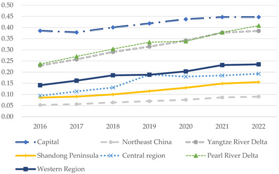 Second, in terms of comprehensive evaluation and spatiotemporal evolution characteristics. Digital maturity shows a gradient pattern of “higher in the east and lower in the west”. The average index of the three major urban clusters (Beijing–Tianjin–Hebei/Yangtze River Delta/Pearl River Delta) reached 0.68 in 2022, while that of the northeast region was only 0.42. Core digital economy cities such as Shenzhen and Hangzhou had an average annual growth rate of over 12%. Resilient cities improved overall but showed regional convergence; the coefficient of variation of coupling coordination degree was only 0.18 in 2022 (0.32 for the digital system). Due to its political centre attribute, Beijing’s safety governance relies slightly less on digital empowerment than other cities.