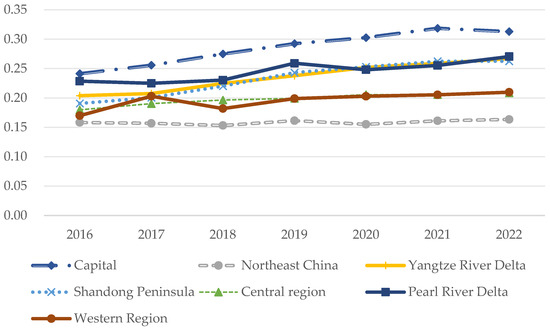 First tier: Due to solid economic foundations, concentrated scientific and technological resources, and policy support, Beijing and Shanghai have consistently led. In 2016, their indices already exceeded 0.42 (Beijing 0.5870, Shanghai 0.4209); in 2022, they approached or surpassed 0.6 (Beijing 0.6929, Shanghai 0.6333). Guangzhou and Shenzhen are close behind, with their 2022 indices reaching 0.5541 and 0.6155, respectively, demonstrating strong growth momentum.