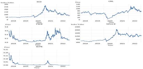 Time series plots of ECO, SPGCE, OIL, PWR, and WPR. (X-axis represents time; Y-axis represents indices value for ECO and SPGCE, and Prices in USD for OIL, PWR, and WPR).
