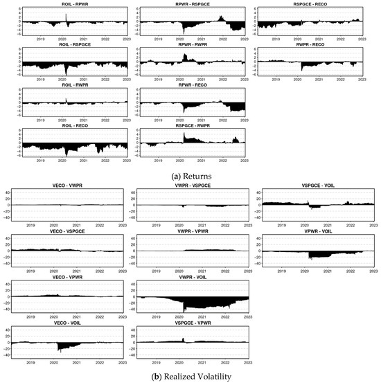 Second, the analysis jointly considers the returns and realized volatility of renewable-energy tokens (Powerledger and Wepower), clean-energy indices, and crude oil, thereby revealing the mechanisms of risk transmission across assets. Earlier studies typically focused only on return co-movements without incorporating realized volatility.
