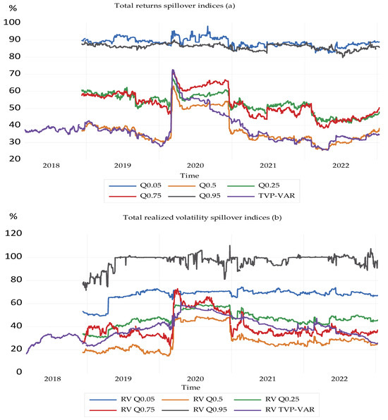 Comparative analysis of overall volatility spillovers using the TVP-VAR model and different quantiles from the QVAR model for green tokens, clean energy indices, and oil prices. Panel (a) illustrates return spillovers, while Panel (b) depicts realized volatility spillovers (X-axis represents time and Y-axis indicates the percentage change in total spillover index in different quantiles).