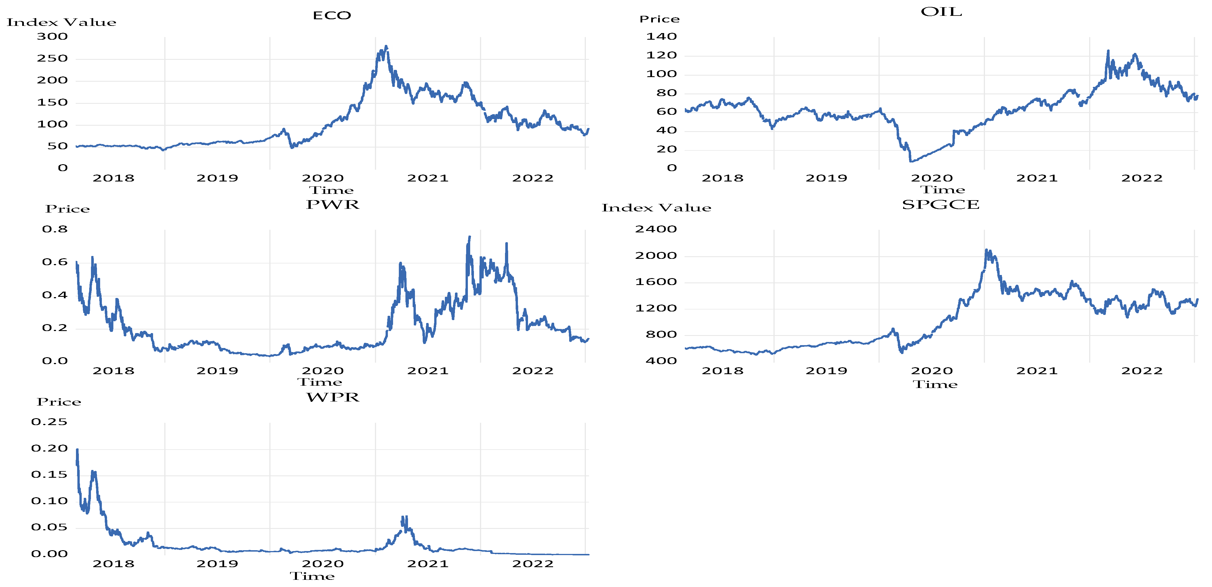 - Ozkan, O.; Abosedra, S.; Sharif, A.; Alola, A.A. Dynamic volatility among fossil energy, clean energy and major assets: Evidence from the novel DCC-GARCH. Econ. Change Restruct. 2024, 57, 98. [Google Scholar] [CrossRef]