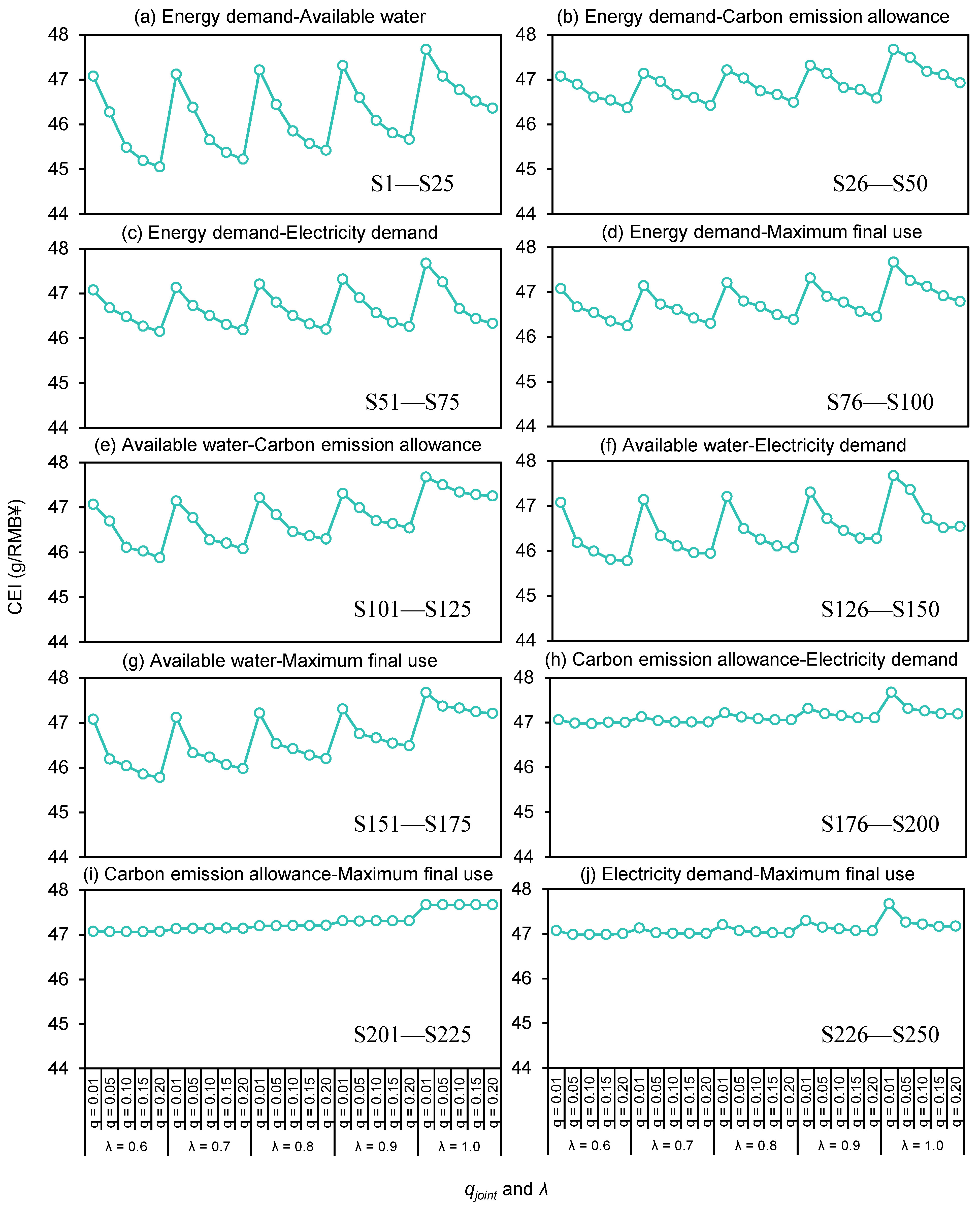 | Sector | qjoint | Raw Coal Demand–Available Surface Water qjoint, qx − qy: 0.010, 0.010 − 0.010 0.100, 0.073 − 0.100 0.200, 0.198 − 0.163 | Raw Coal Demand–Carbon Emissions Allowance qjoint, qx − qy: 0.010, 0.010 − 0.010 0.100, 0.064 − 0.057 0.200, 0.141 − 0.141 | Available Surface Water–Carbon Emissions Allowance qjoint qx − qy: 0.010, 0.010 − 0.010 0.100, 0.063 − 0.058 0.200, 0.133 − 0.149 | Available Surface Water–Electricity Demand qjoint, qx − qy: 0.010, 0.010 − 0.010 0.100, 0.073 − 0.100 0.200, 0.198 − 0.163 | Electricity Demand–Maximum Final Use qjoint, qx − qy: 0.010, 0.010 − 0.010 0.100, 0.078 − 0.099 0.200, 0.200 − 0.091 | |||||