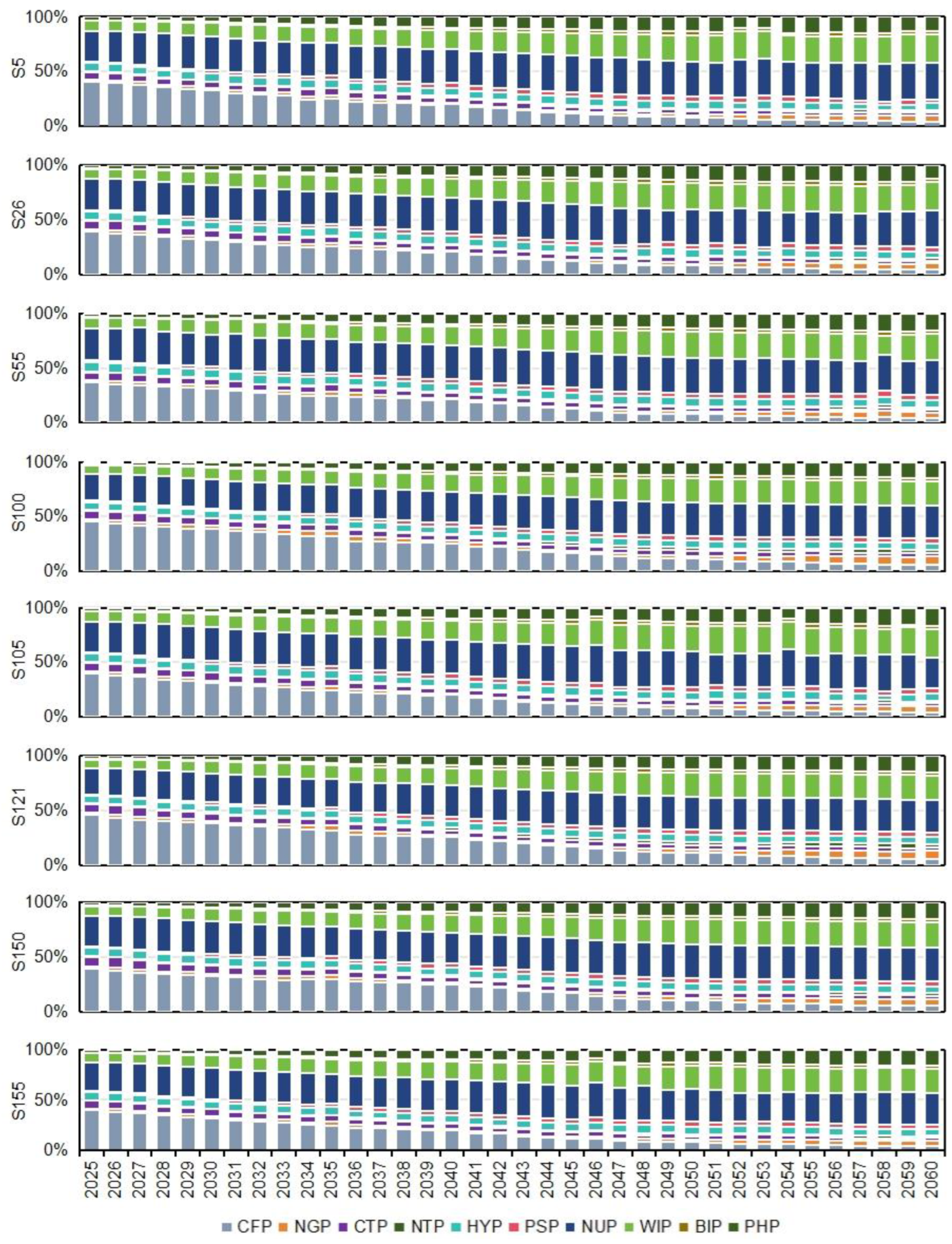 - The investment of low-carbon energy conversion capacities for green low-carbon electricity generation, e.g., WIP, PHP, and NUP would expand to 40.12 GW, 36.35 GW, and 31.78 GW by 2060;