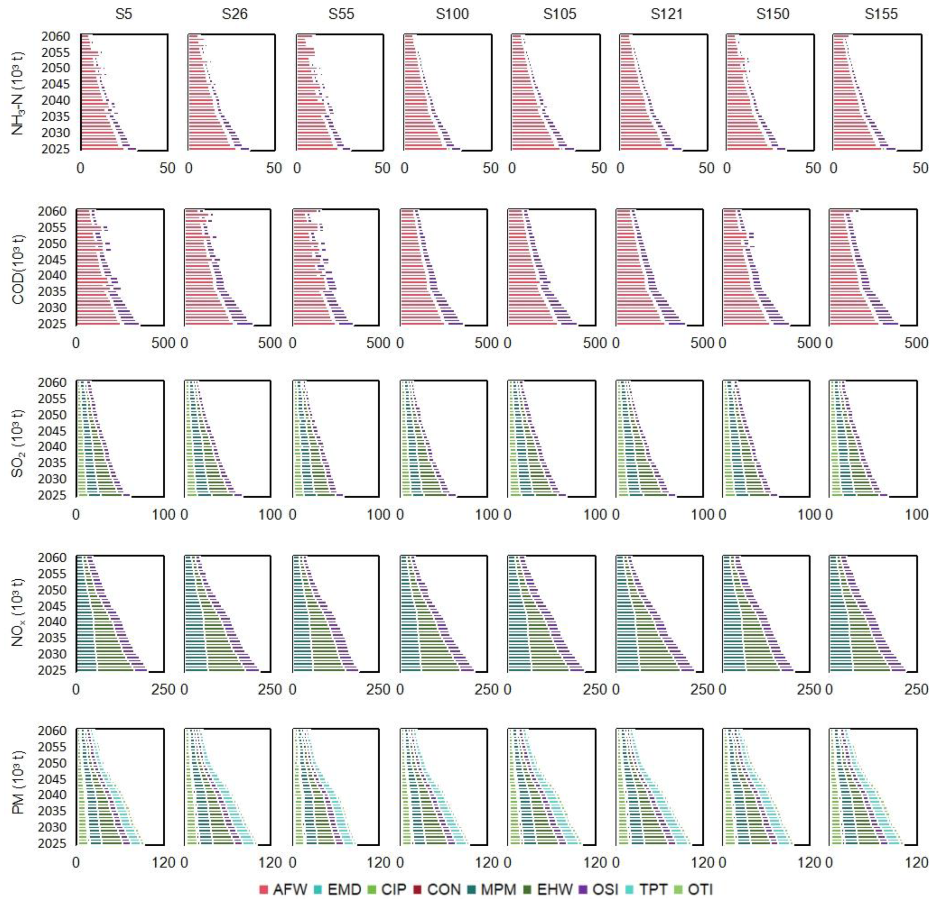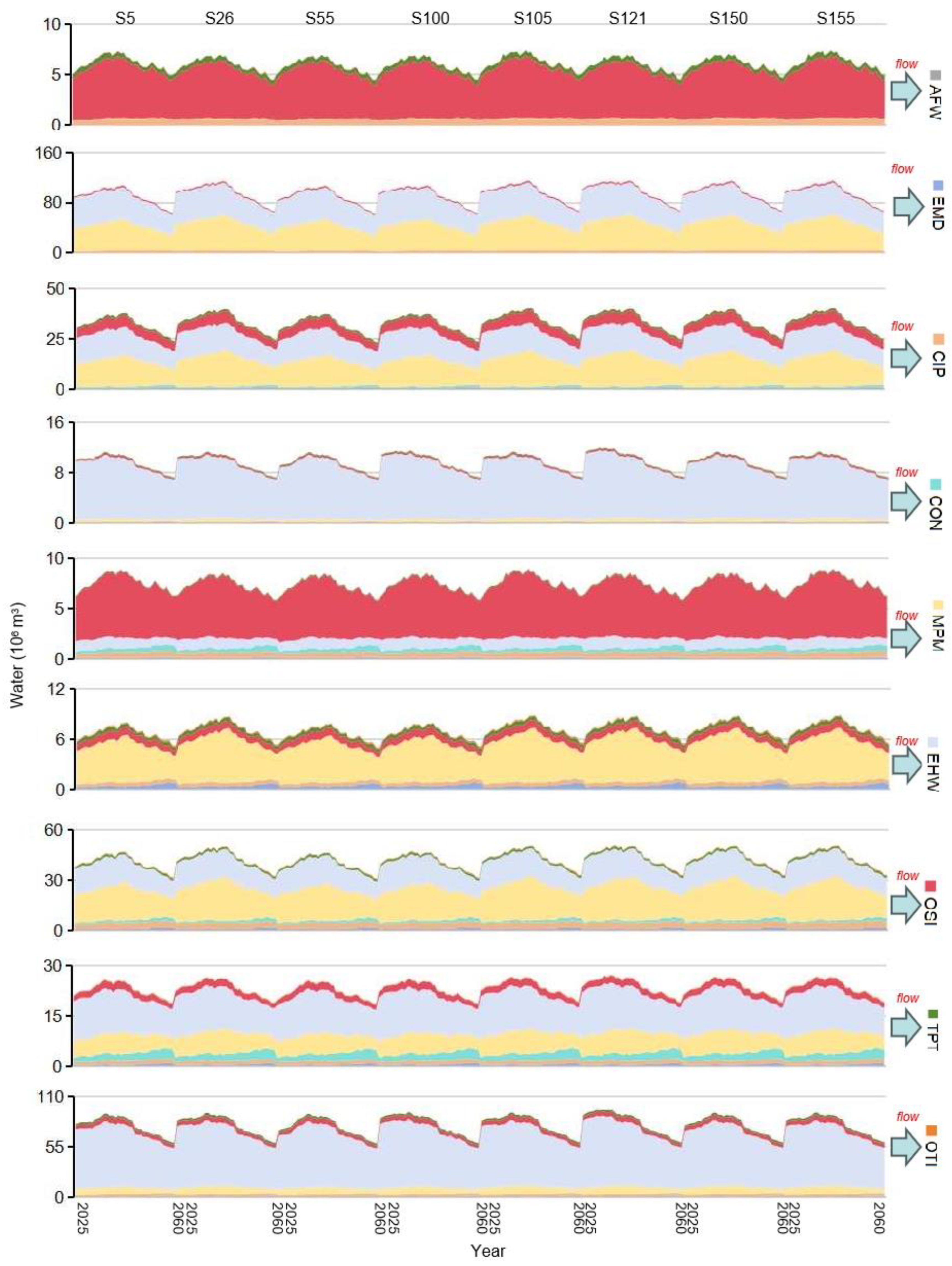 - The reduction in freshwater allocation to the system is helpful for relieving water shortage, e.g., decreasing to 362.96 × 106 m3 in 2030, and to 254.26 × 106 m3 in 2060;