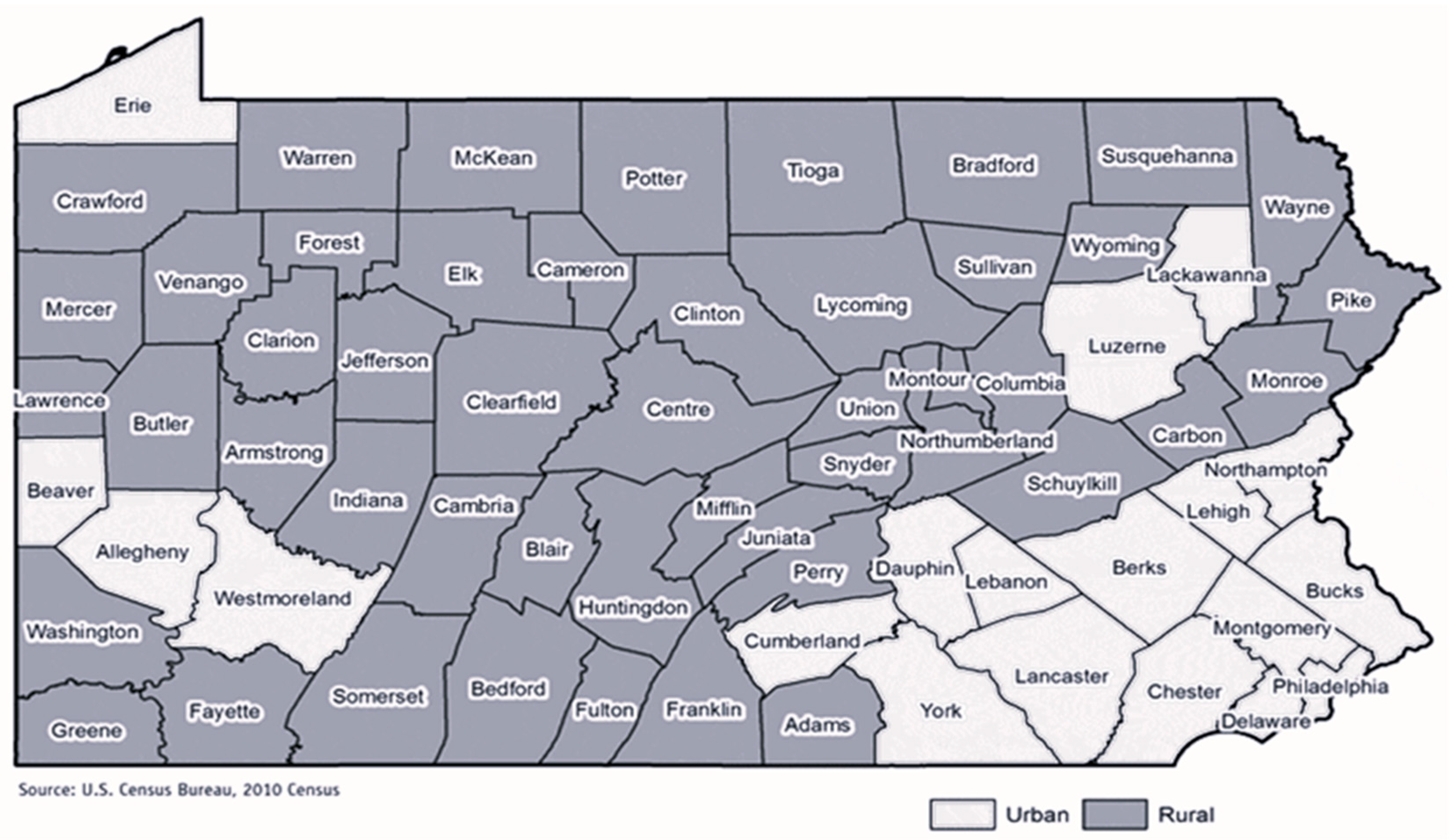The next regression model we estimate simply adds another dummy variable to the model: one that is equal to ‘1’ if the county is labeled as ‘urban’ by the Center for Rural PA or ‘0’ otherwise: