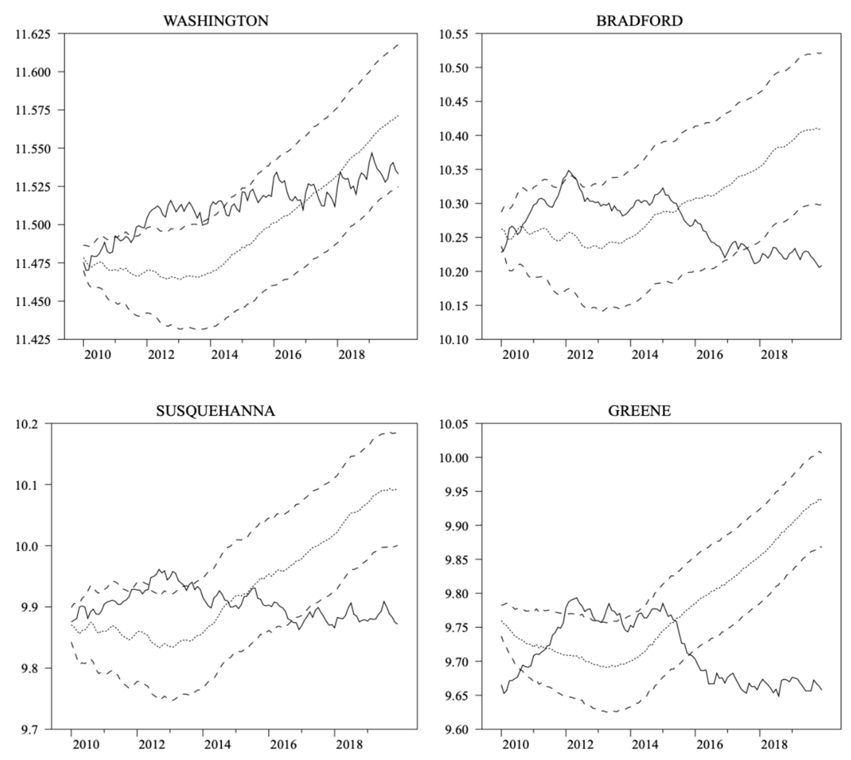Figure 3 presents the actual time path of the log of employment for each county in the 90th percentile and above in drilling intensity (shown by the solid line) against its forecast and associated standard error bands, shown by the dashed lines. Washington county, which had the most unconventional wells developed over the relevant time period, did see employment levels consistently above forecast from around mid-2011 through the end of 2015 and saw employment above the upper standard error band from late 2011 to late 2013. Bradford and Susquehenna saw employment levels rise above the upper standard error band—briefly in 2011 for Bradford and in 2012 for Susquehenna—before ultimately falling back below forecast by 2014–2015. Greene county had employment levels well below forecast for most the months from 2010–2019, save for a three-year period from 2011–2014, in which its employment levels were above forecast, even breaking through the upper confidence band in 2012 and the first half of 2013. The results in