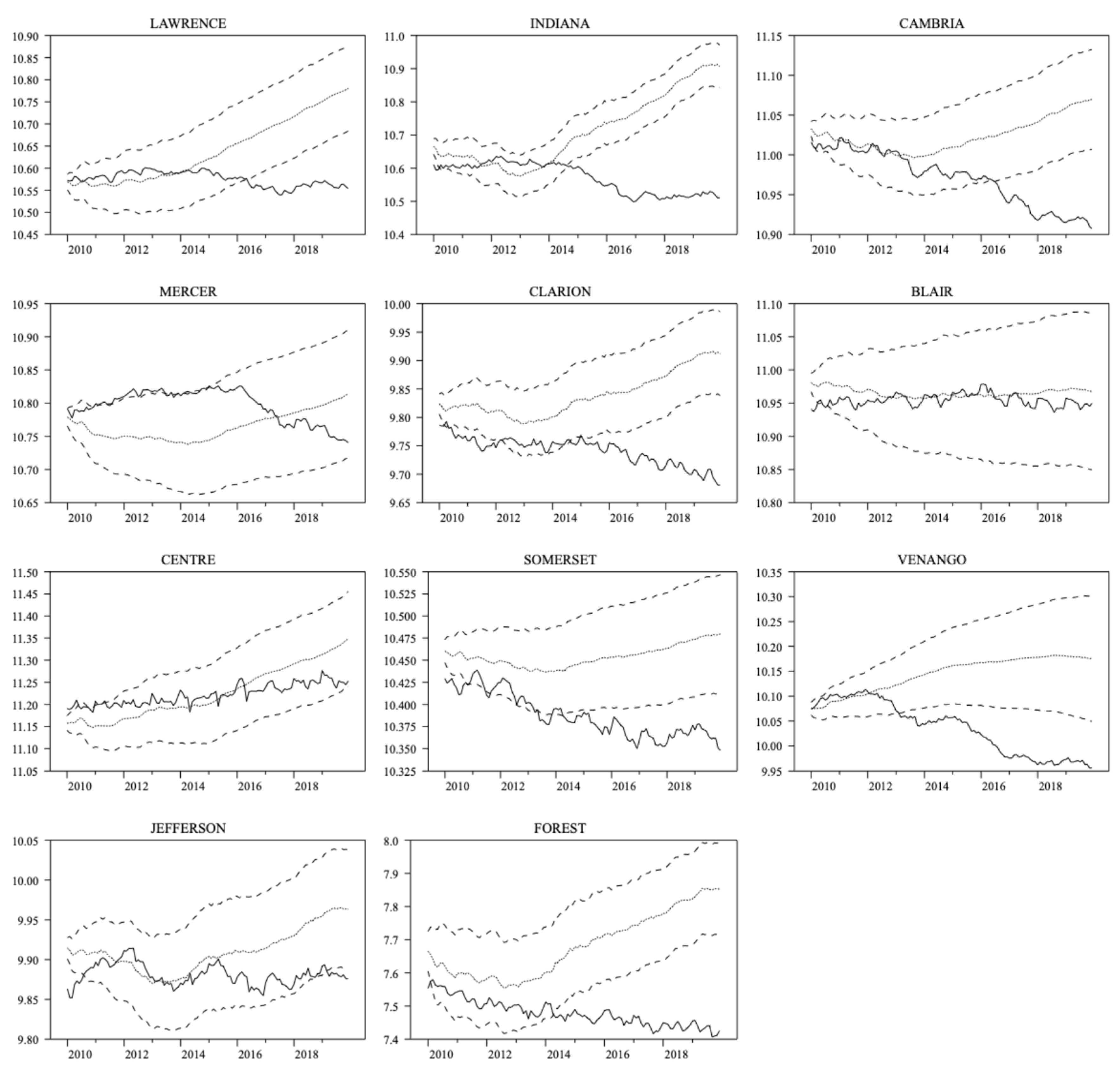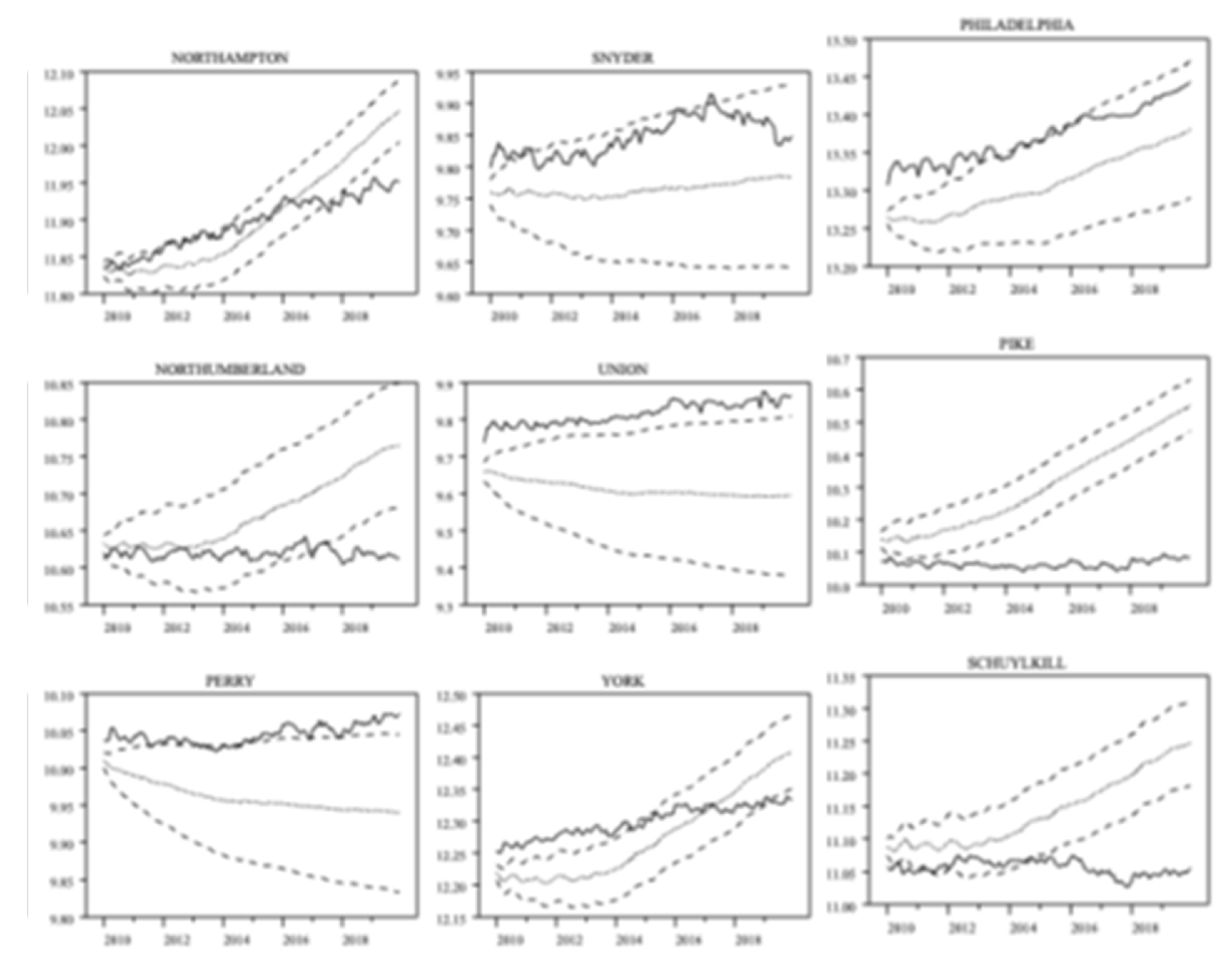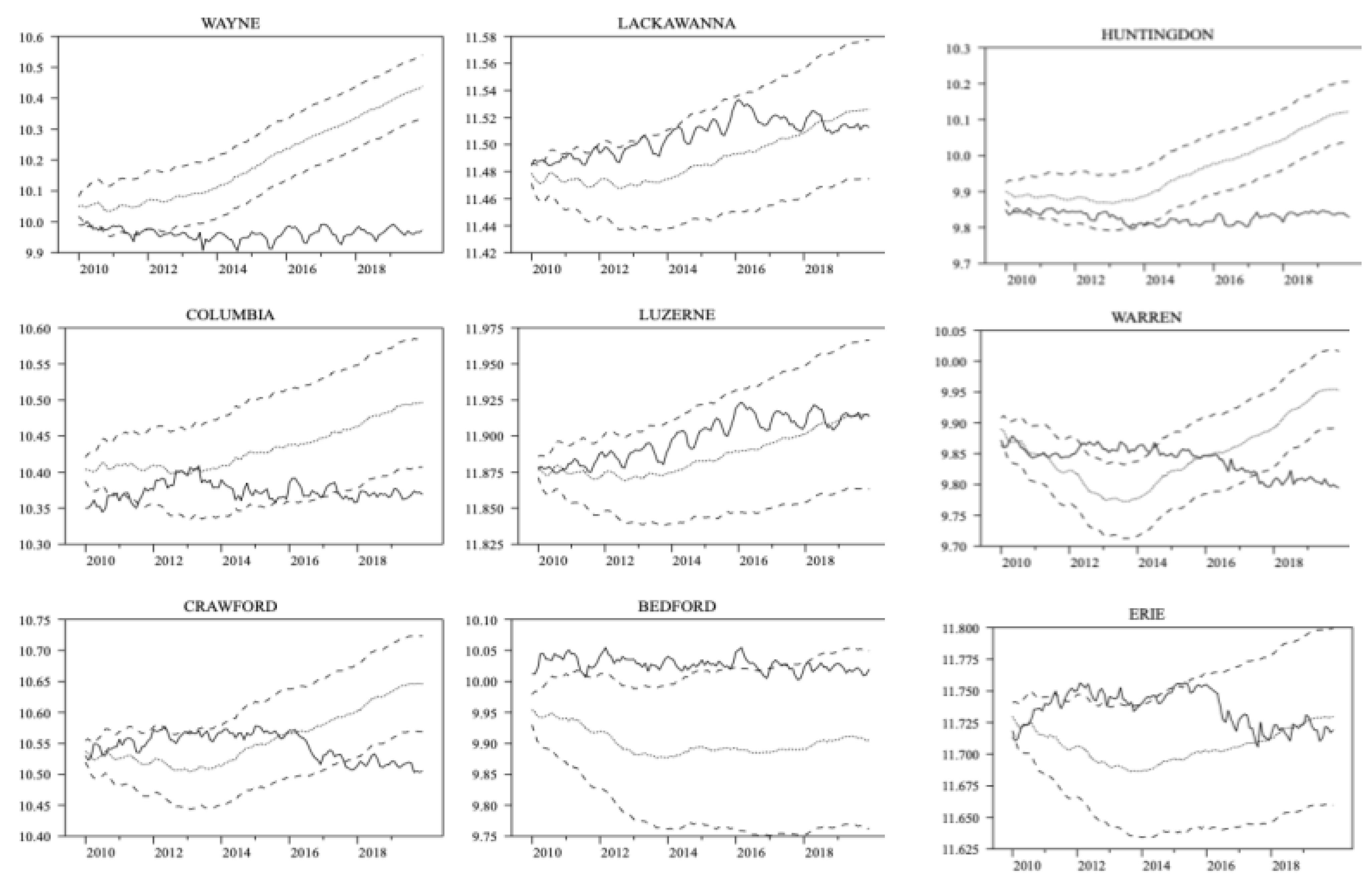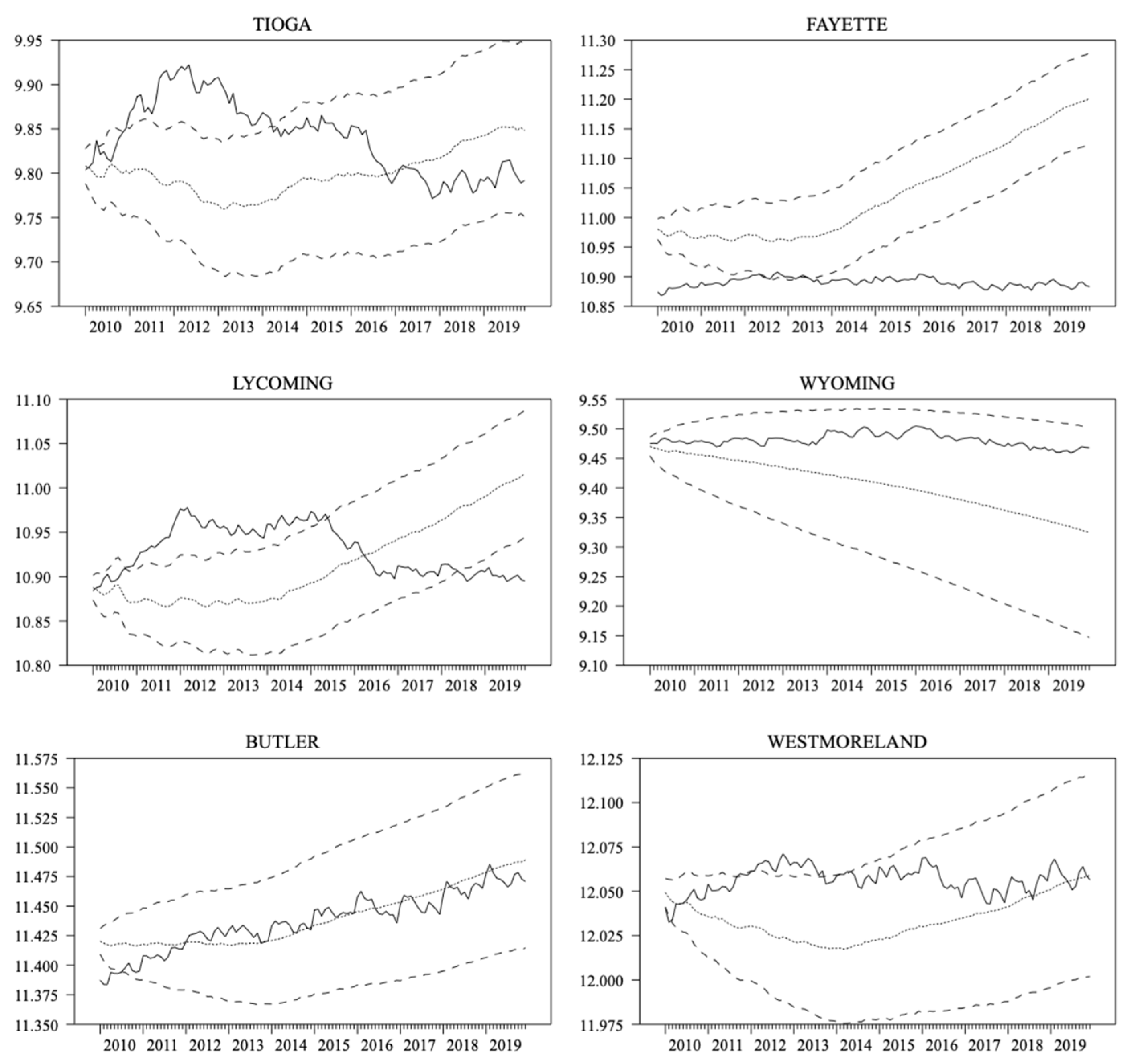 Figure 3, taken as a whole, do seem to paint a picture that PA counties in the upper decile of unconventional drilling activity did have employment levels above forecast, some decidedly so, for at least some of the period from 2010–2019, usually during the 2011–2014 range and more consistently for Washington county.