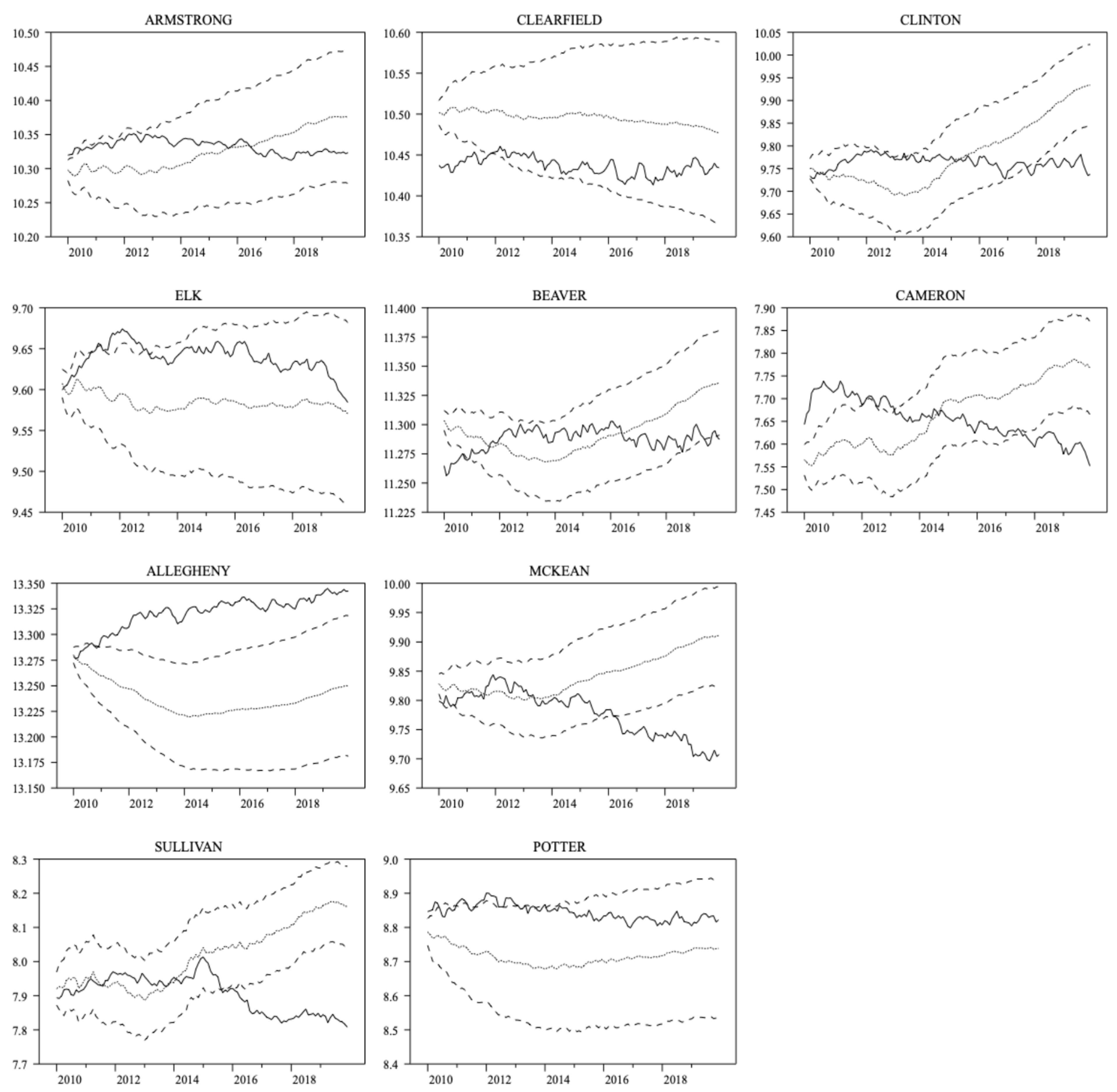 Figure 5 presents employment levels versus forecast for the ten counties in the 50th–74th percentile for number of unconventional wells drilled. Allegheny stands out in having employment levels above forecast in a statistically significant way for essentially the entire forecast period. It should be noted that Allegheny is the county housing the city of Pittsburgh, Pennsylvania’s second largest city and its urban anchor in the western part of the state. Armstrong, Elk, Cameron, and Potter saw employment eclipse the upper bound of the forecast interval for at least some portion during the first few years of the forecast horizon. Clinton and Beaver counties saw employment exceed forecast for substantial periods from 2011 to 2015 (2016 for Beaver) before falling below forecast for the latter part of the forecast period. Sullivan and McKean closely tracked their employment forecasts until 2015, when they began to lag substantially behind. Clearfield is the only county in this grouping whose actual employment levels were always below forecast for the entire 2010–2019 sample.