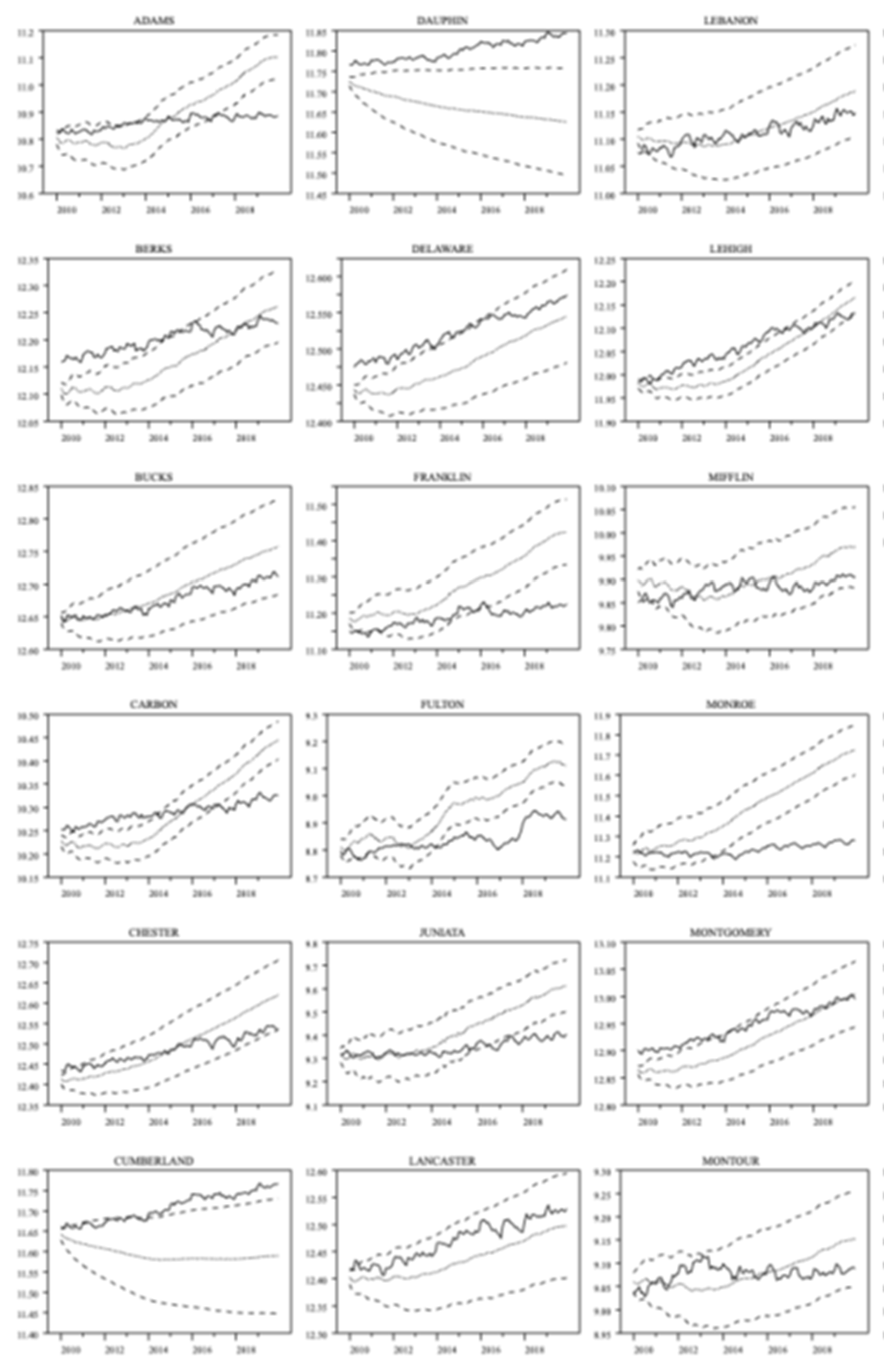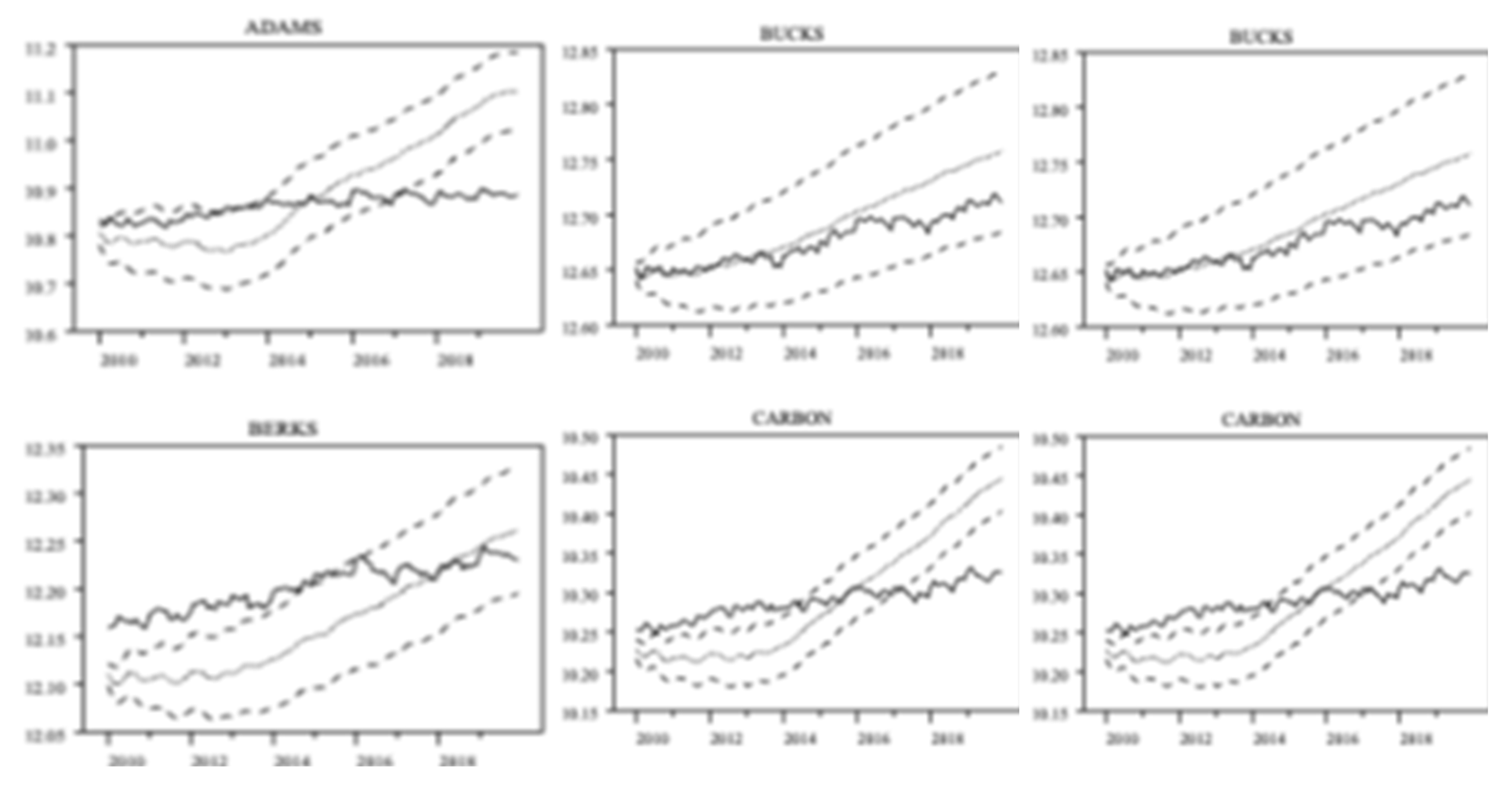 Figure A1). As before, a number of these counties have employment levels within the standard error bands until the latter portions of the forecast horizon. Others were seen to be above forecast for the entire sample, notably the urban counties in the southeast portion of the state: Berks, Delaware, Lehigh, and Philadelphia. The worst-performing counties relative to forecast among this group are Pike, Monroe, and Schuylkill, whose employment levels stayed consistently below forecast for the entire sample period and were often below the lower standard error band.