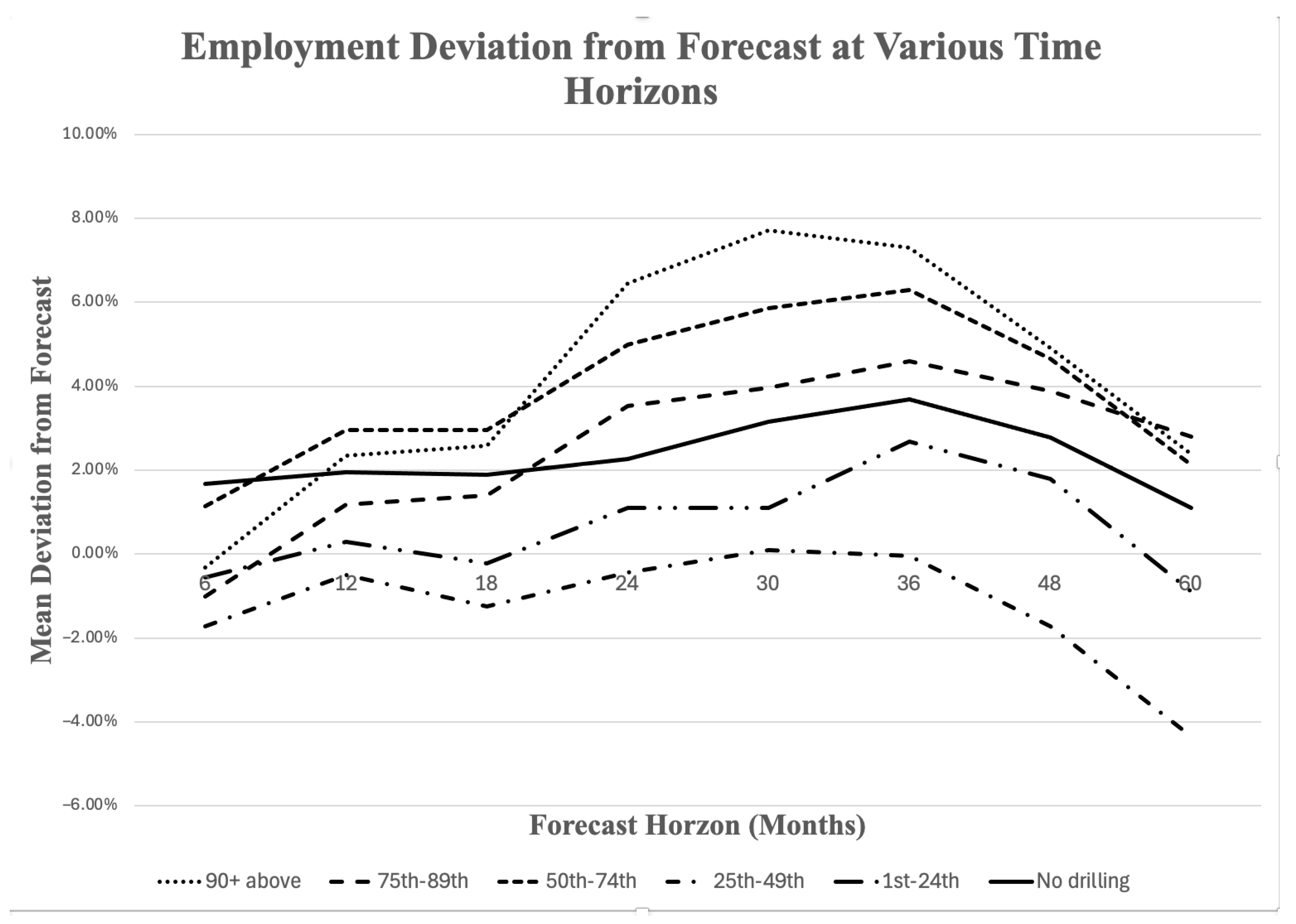 Figure 9 illustrates that counties in the 1st–24th and the 25th–49th percentile groups never outperformed the non-drilling benchmark at any forecast horizon within five years after the fracking boom took place. Additionally, note that the relative employment benefit to fracking clearly seems to dissipate at the four-to-five-year forecast horizon, consistent with the findings presented thus far and of those uncovered by others.