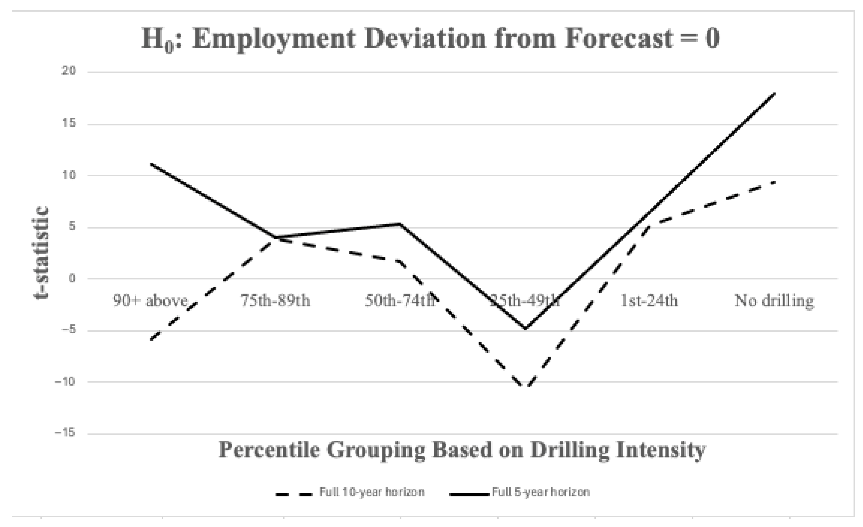 To gain further insight into the relationship between drilling activity and county employment levels relative to what would have otherwise been forecast, we next take each county and examine the extent to which its actual employment was different from forecast for both the full ten-year span from 2010–2019 and the five-year span from 2010–2014. Specifically, for each county, for the ten-year forecast horizon, there are 120 monthly observations of employment deviations from forecast. Once we have these 120 observations for a specific county, we test the null hypothesis that the average of these deviations is different from zero and obtain the associated t-statistic. We then take the average of this t-statistic for the counties in each of the aforementioned percentile groupings based on drilling intensity and report them in