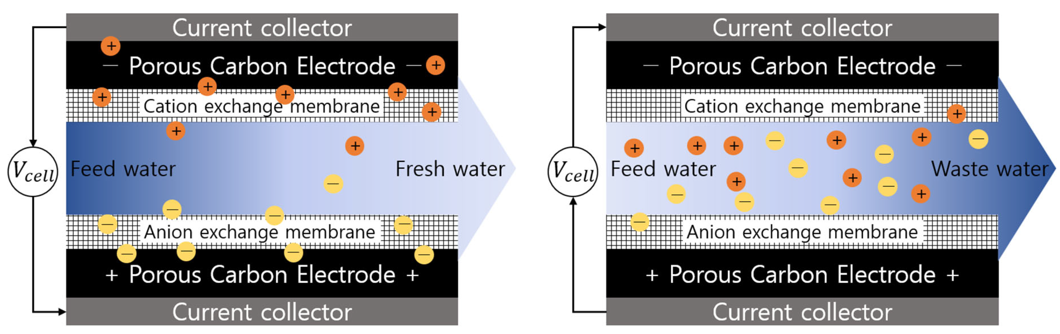 - Gao, X.; Omosebi, A.; Landon, J.; Liu, K. Enhanced salt removal in an inverted capacitive deionization cell using amine modified microporous carbon cathodes. Environ. Sci. Technol. 2015, 49, 10920–10926. [Google Scholar] [CrossRef] [PubMed]