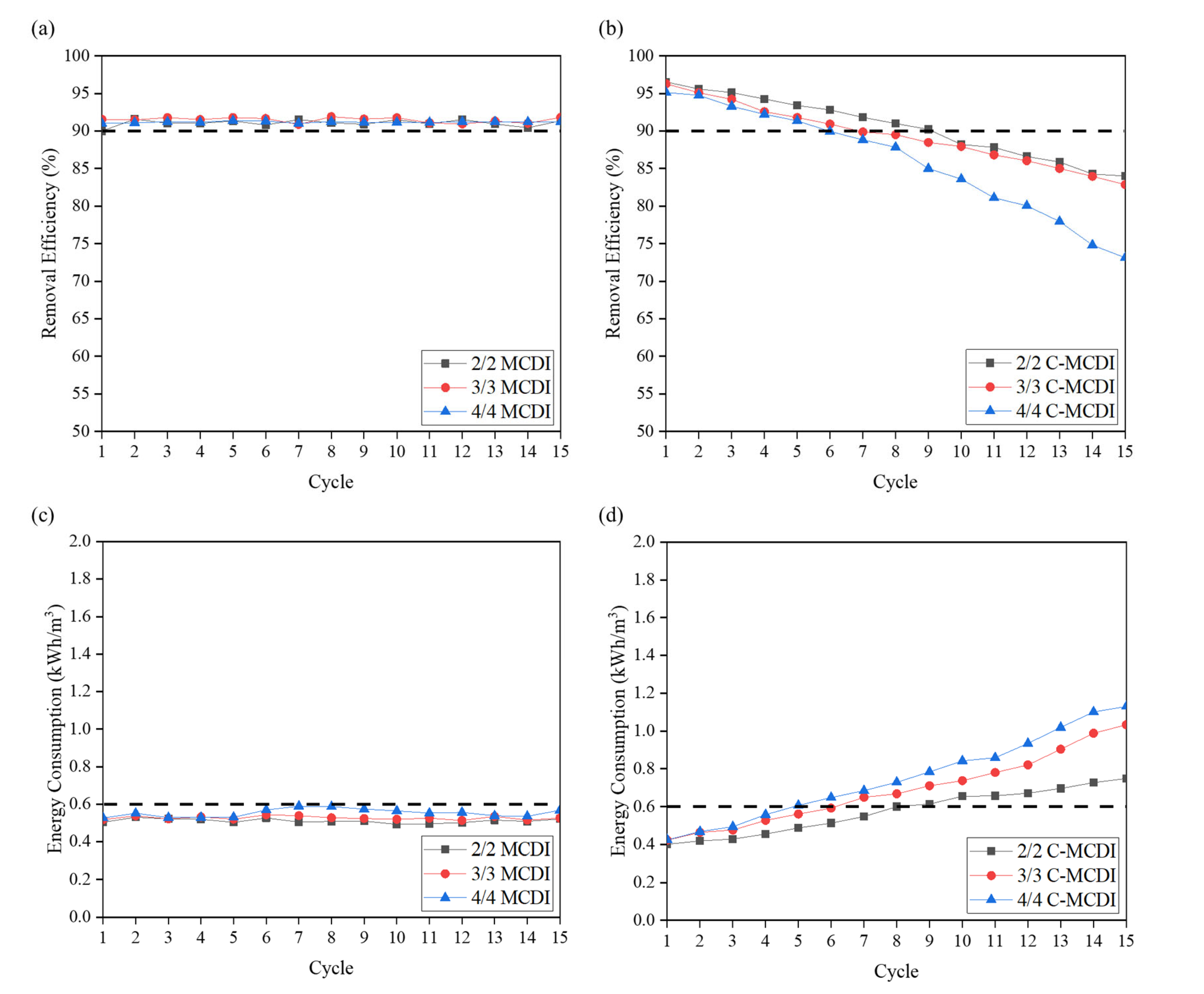 3.2. Removal Efficiency and Energy Consumption Under Symmetric Conditions