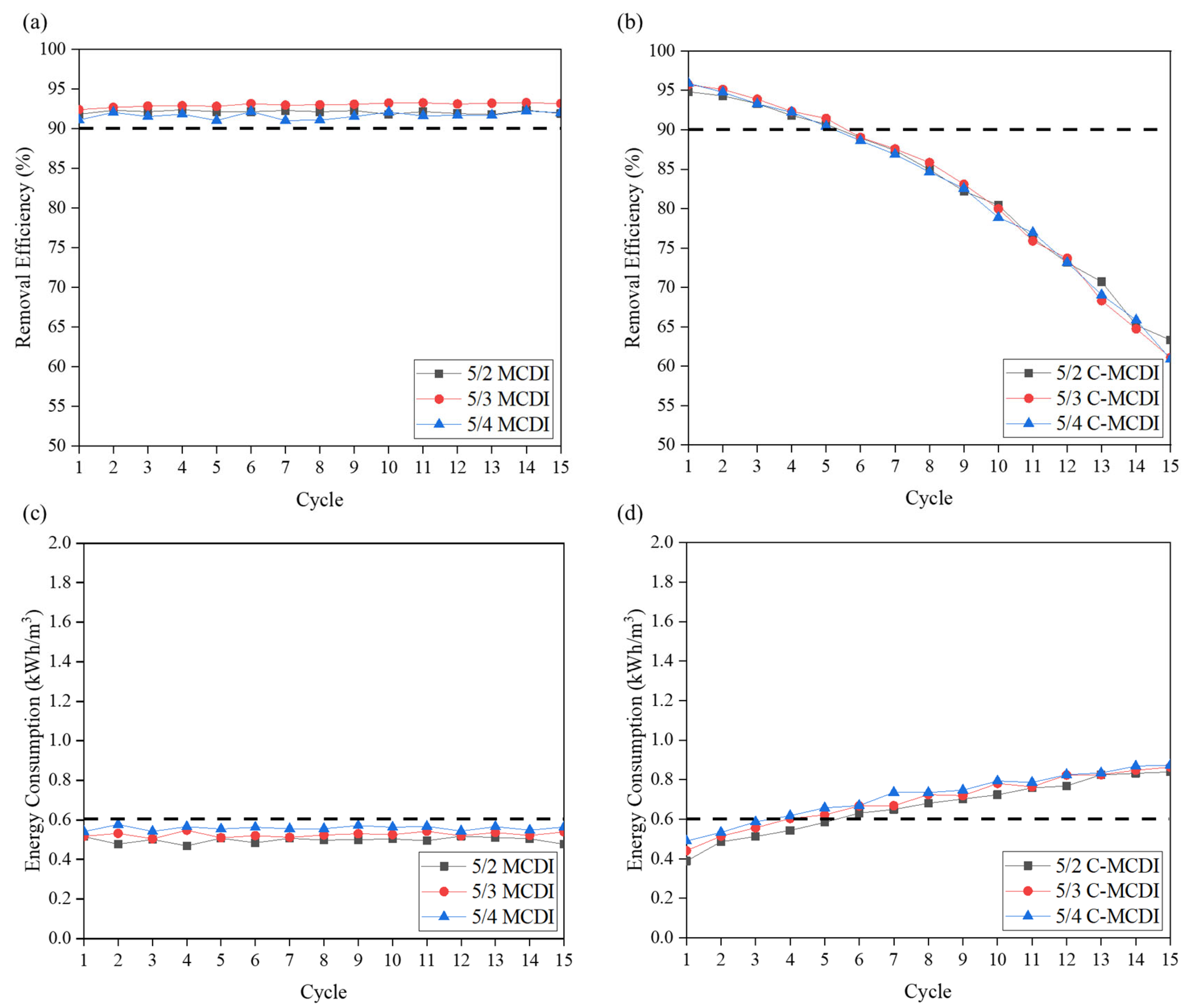 | Conditions | Removal Efficiency (%) | Energy Consumption (kWh/m3) | Feasible Cycle Count |