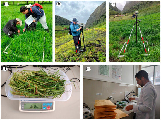 Procedure for aboveground biomass (AGB) collection in high-Andean pastures: (a) manual measurement of grass height within 1 × 1 m frames; (b,c) georeferencing of frames using GNSS receivers; (d,e) weighing of fresh samples with a digital balance and preparation for oven-drying.